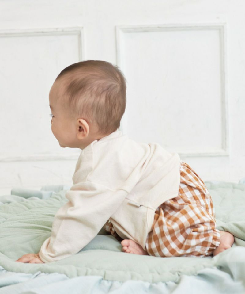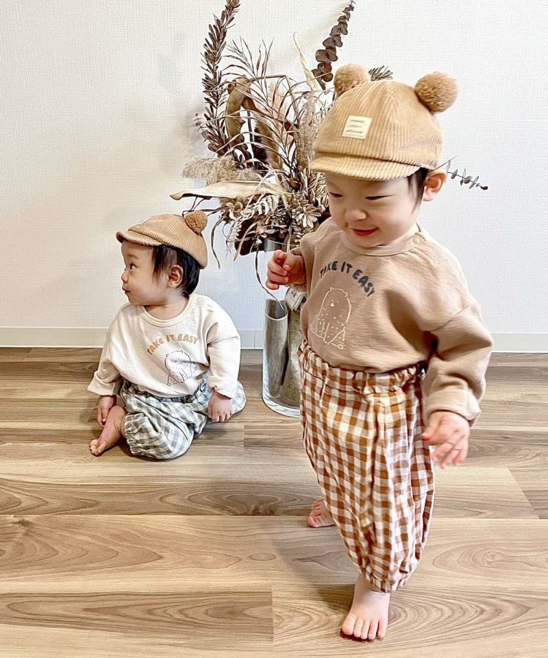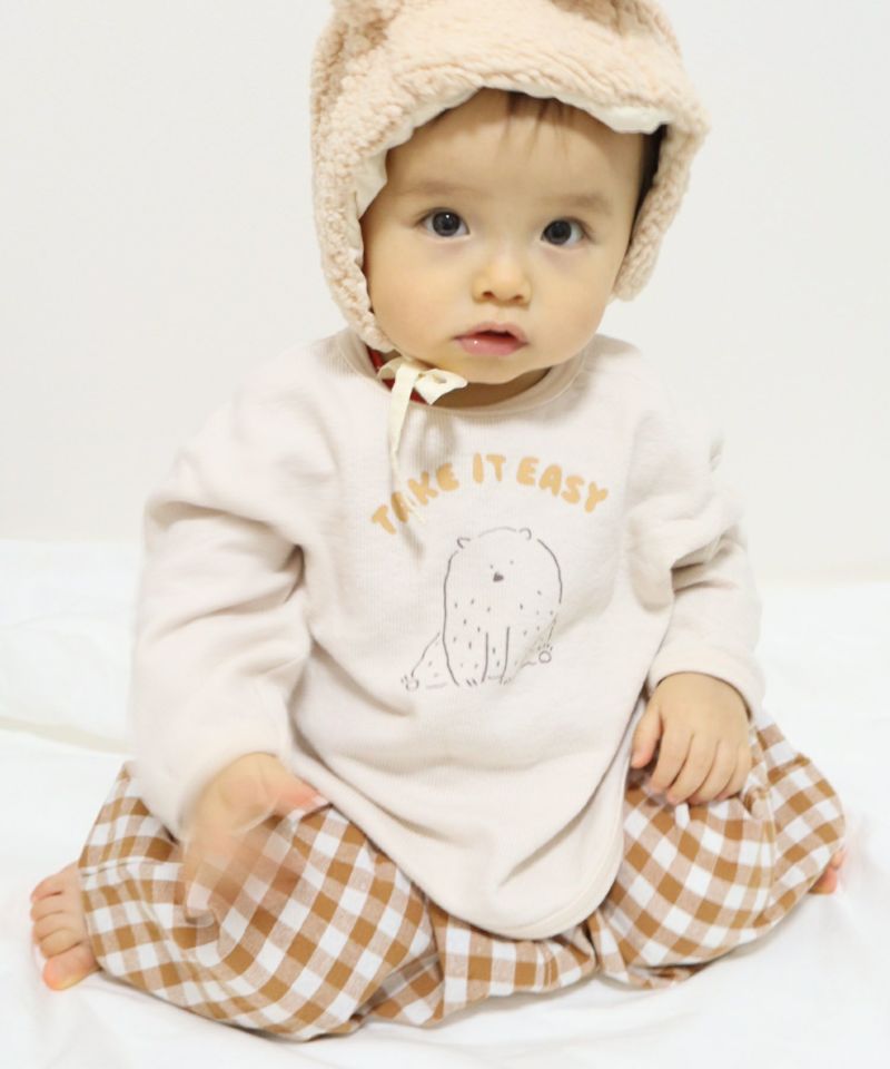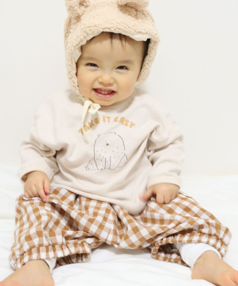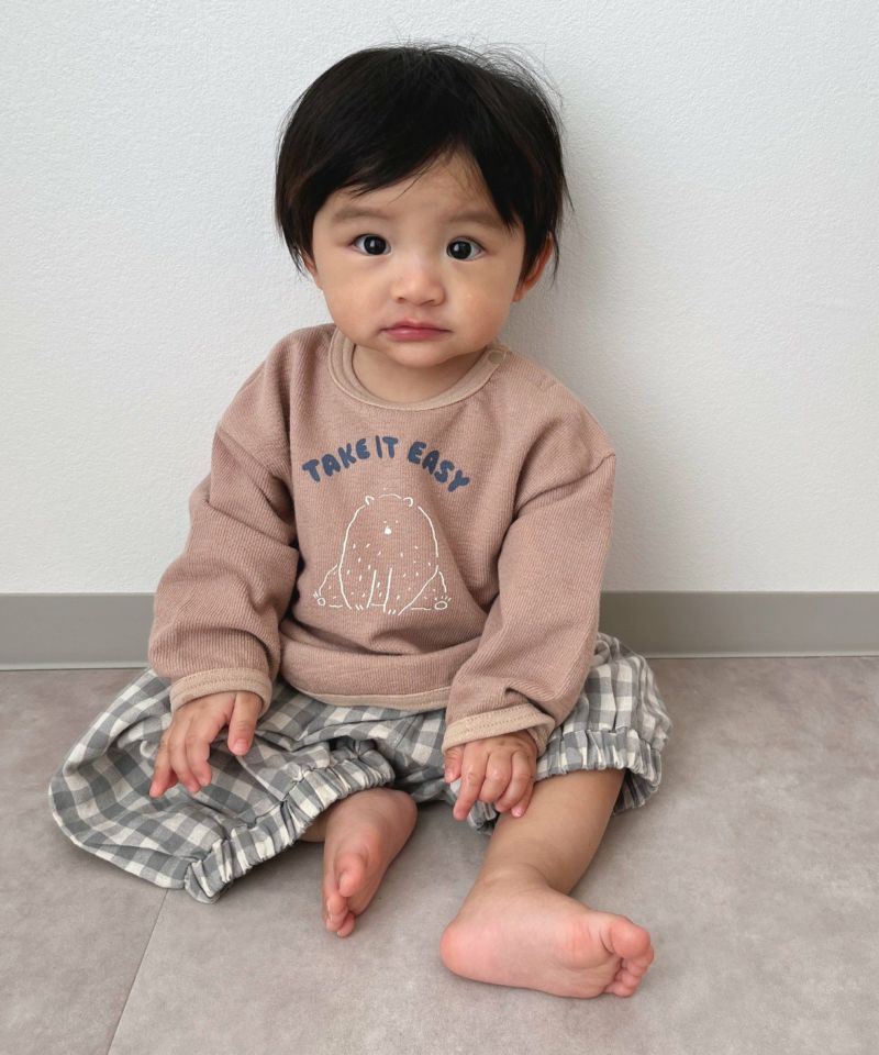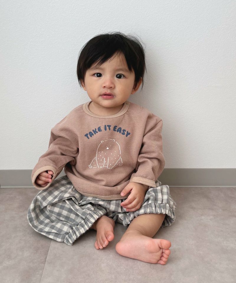 甘撚りのやわらかいカットソーのトップスと、まるっこいシルエットのギンガムチェックのボトムスのセットです◎