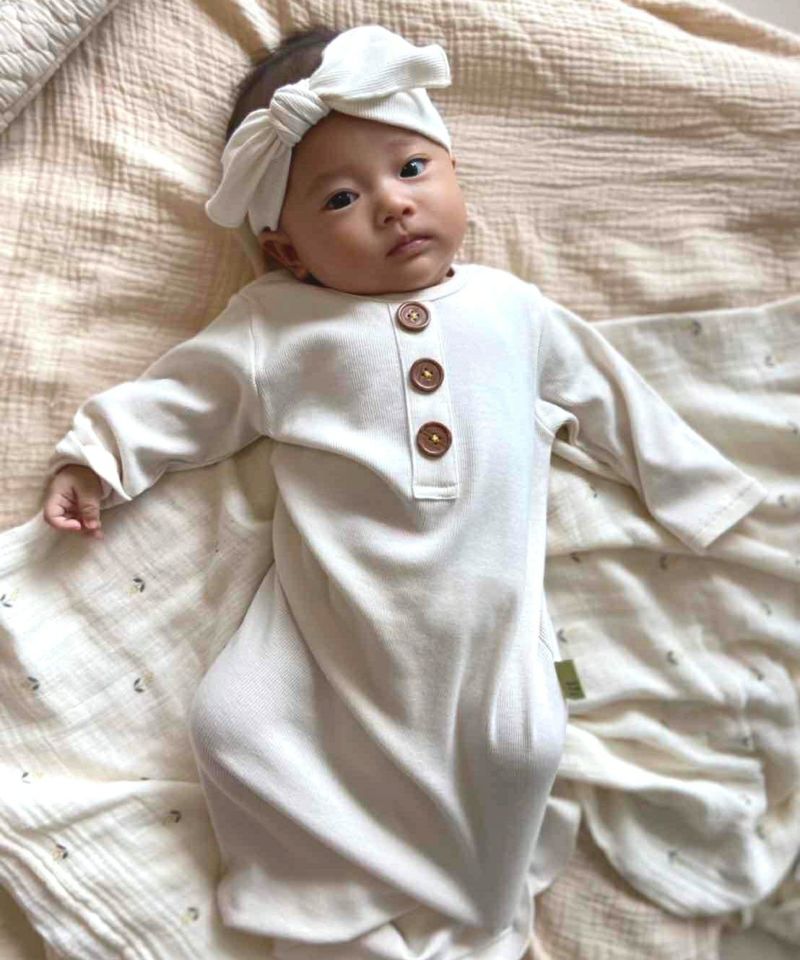 足部分を軽く結ぶ仕様になっているので、おむつ替えもラクチン♪