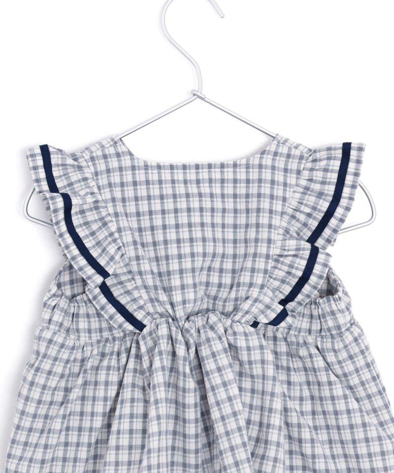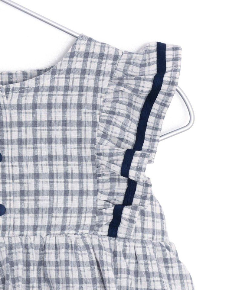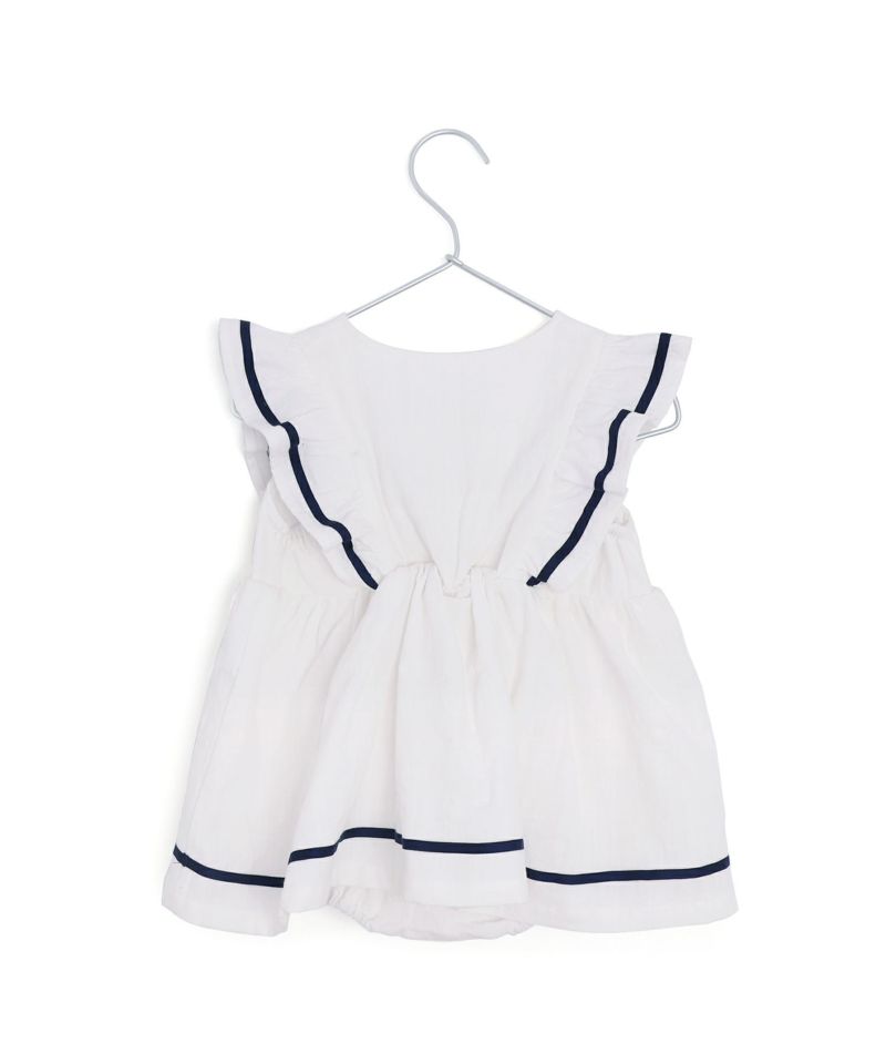 セーラー風のデザインのフリルが夏らしいかわいいロンパース。