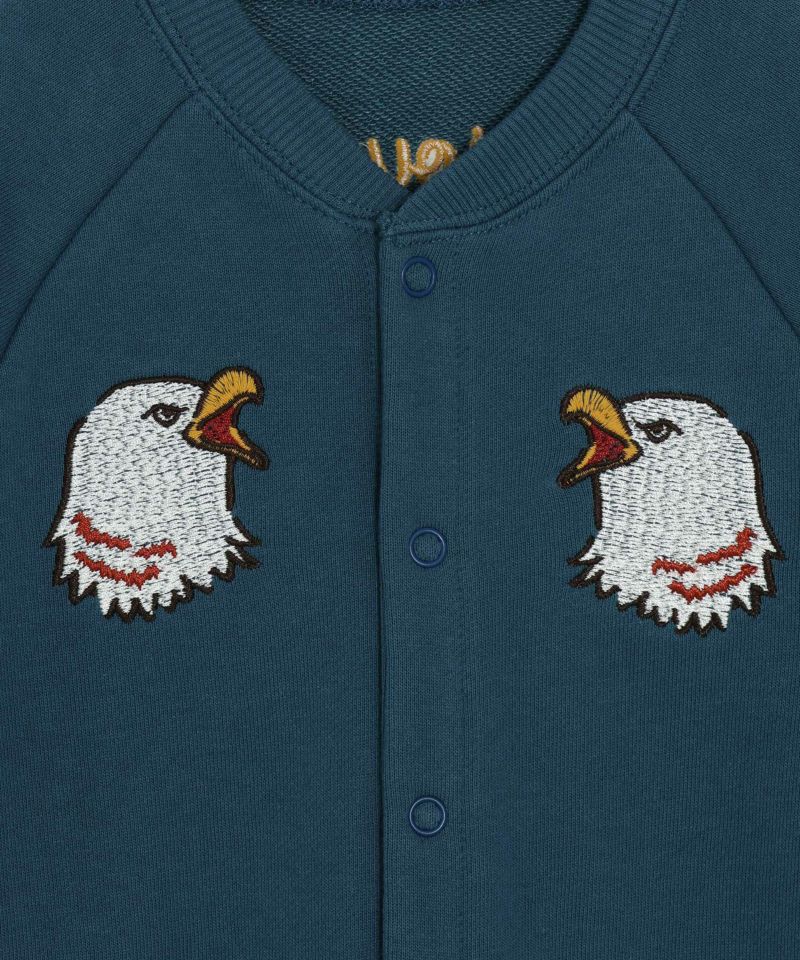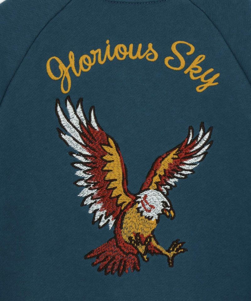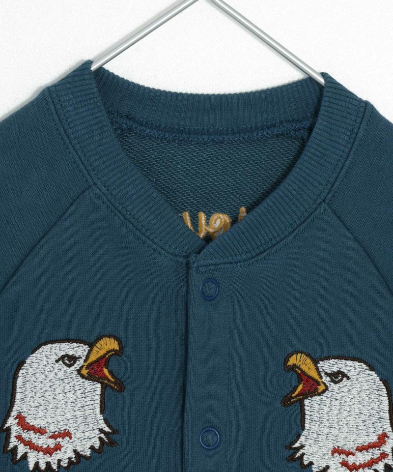 スカジャンのようなラグランスリーブで、イーグルの刺繍がとんでもなくかっこいいロンパスに仕上がりました。