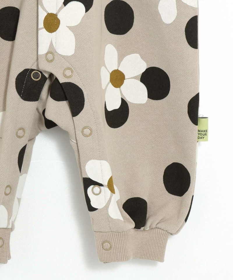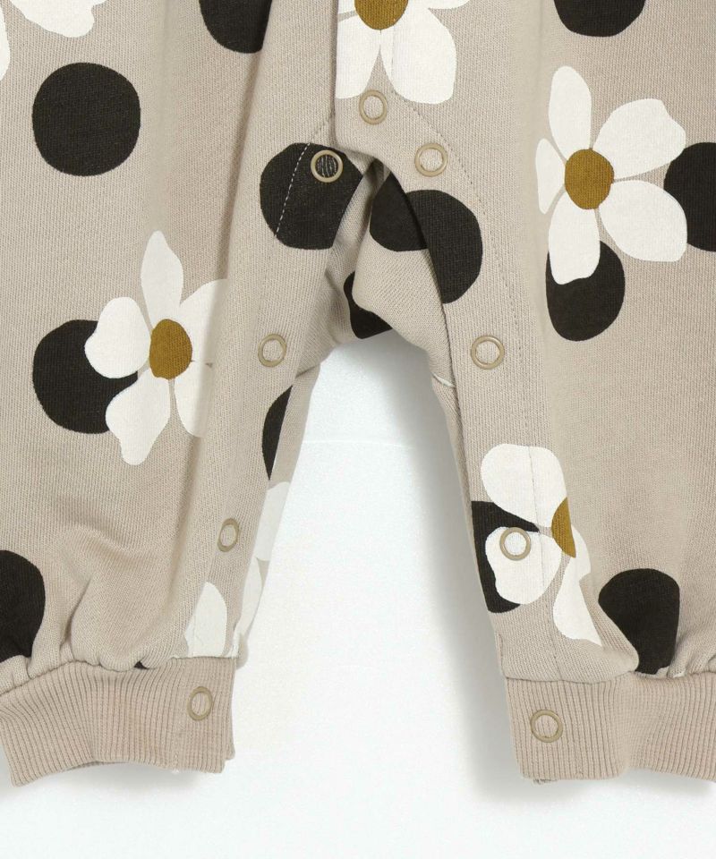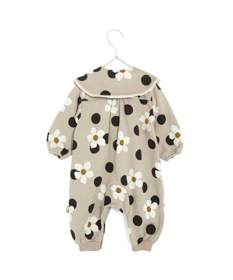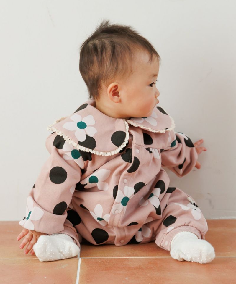 大きなお花と大きなドットを組み合わせて、さらに大きな衿がかわいいカバーオール。