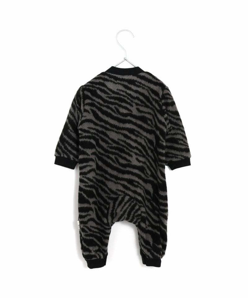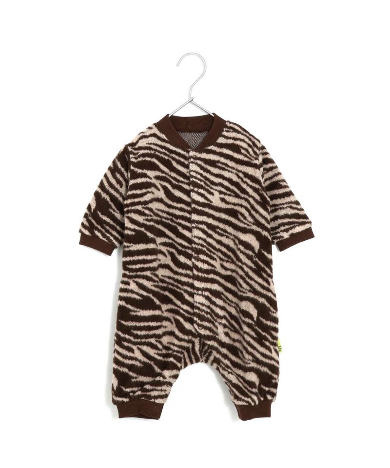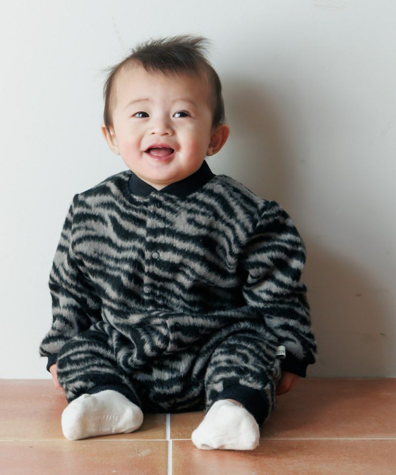 毛足の長い糸を使用してゼブラ柄を表現したカバーオール。