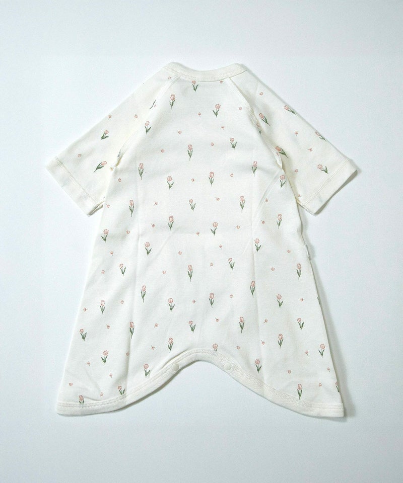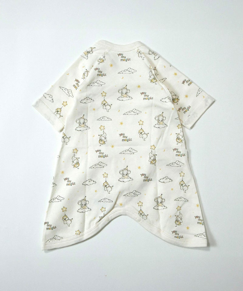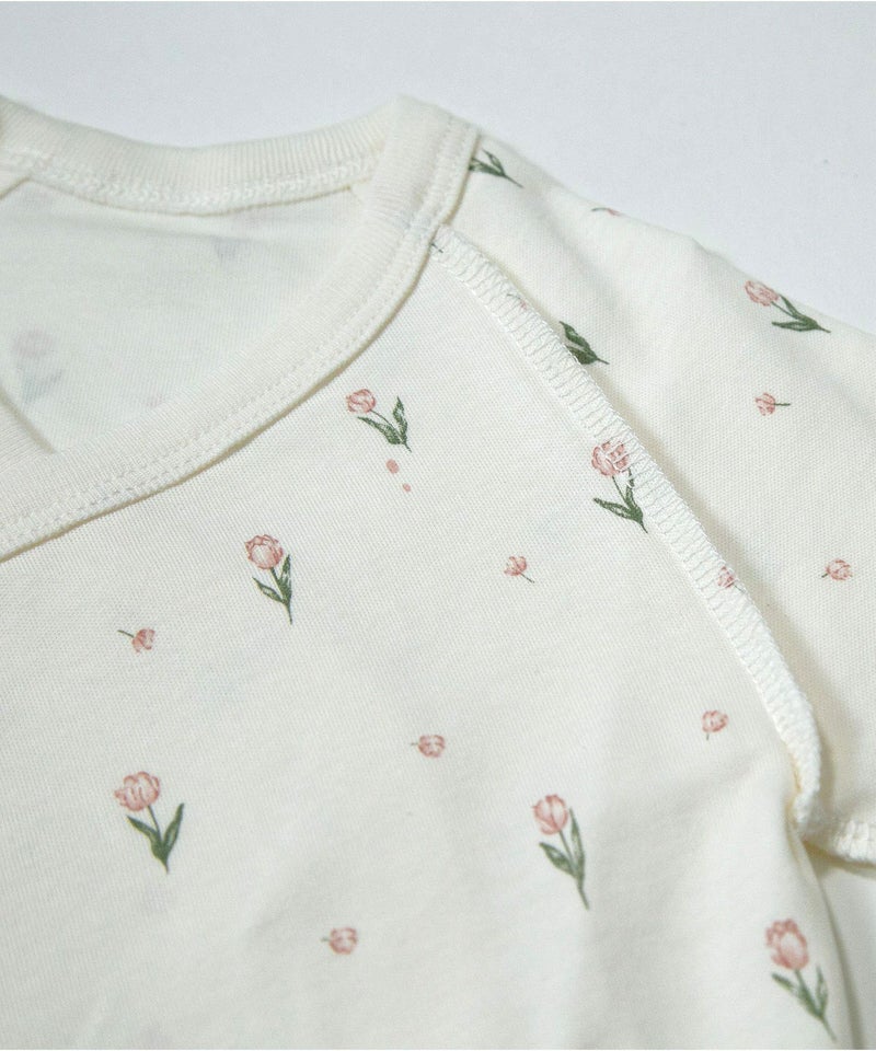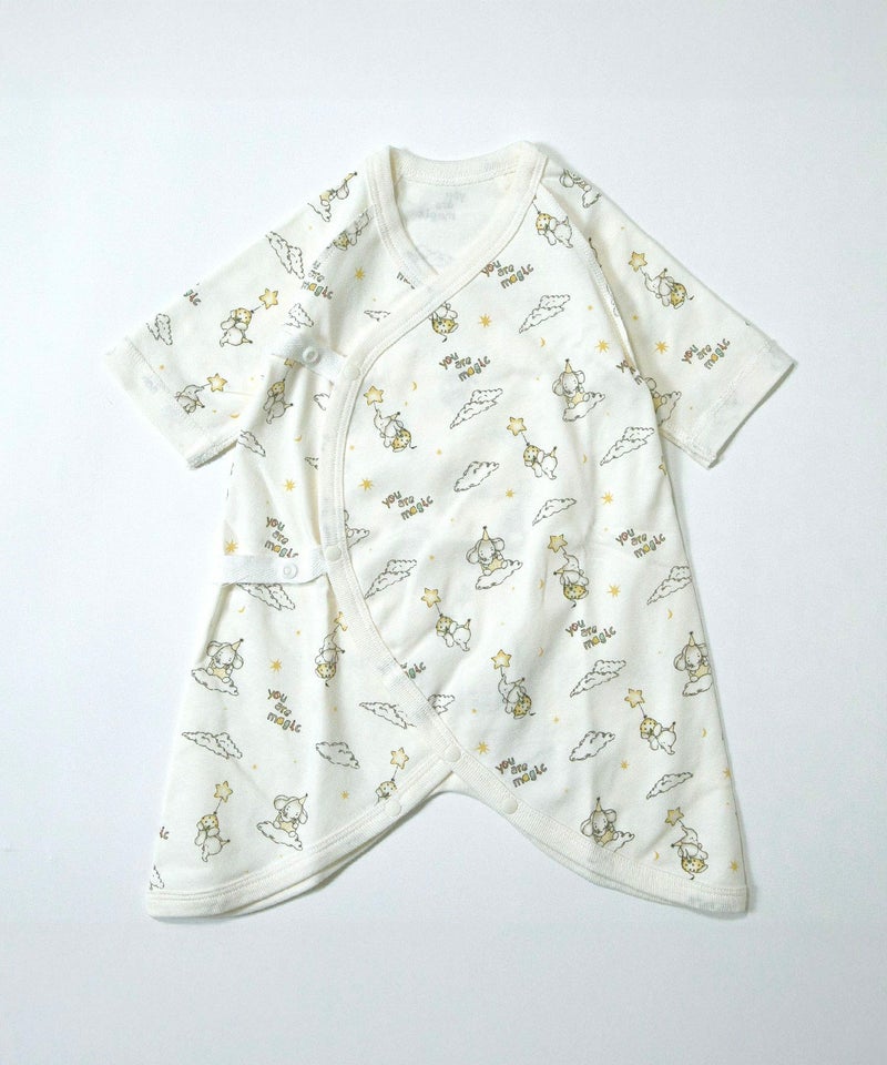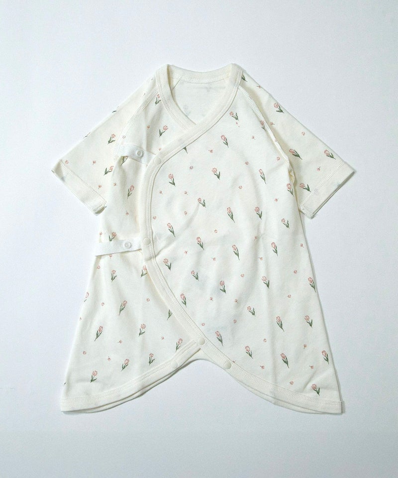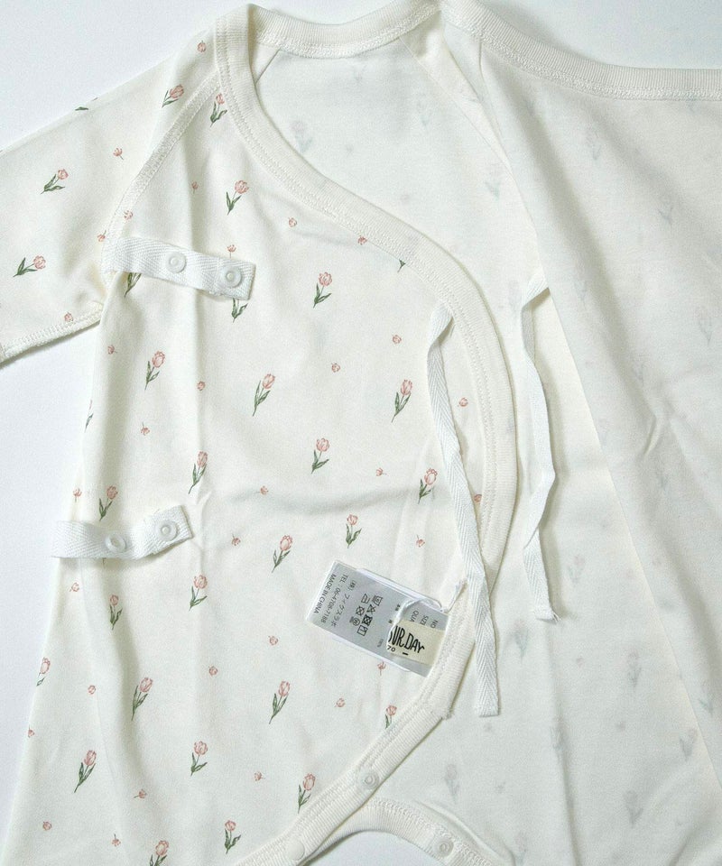 メルヘンチックな空を飛ぶゾウさんと、春らしい上品なチューリップ柄のベビーウエア。