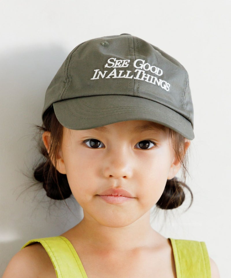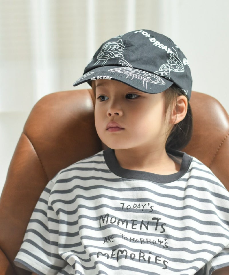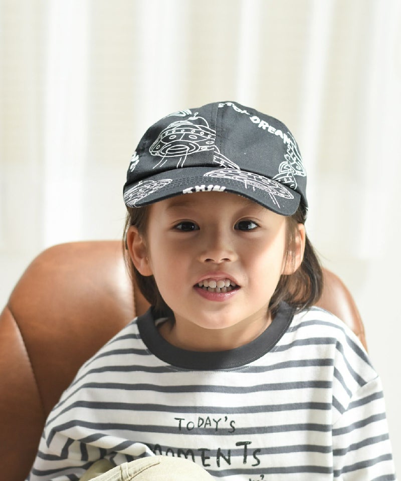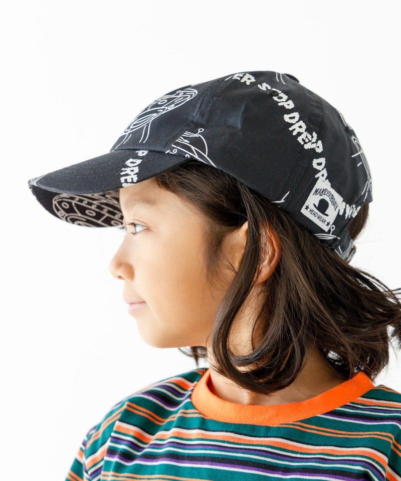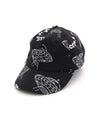 インパクト強めの総柄とシンプルなロゴのキャップ。