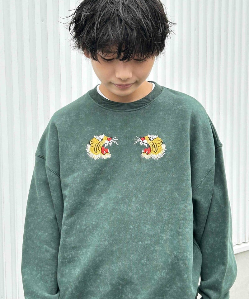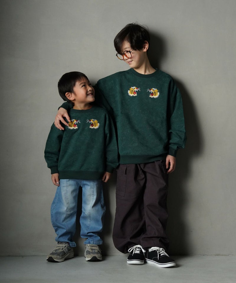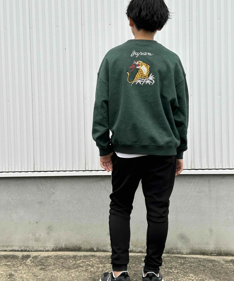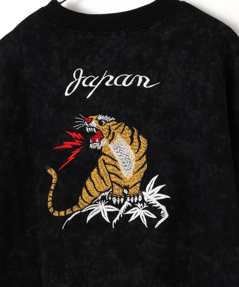 ムラ染めの裏毛素材に、スカジャン風のトラさんの刺繍がとんでもなくかっこいいトレーナーに仕上がりました。