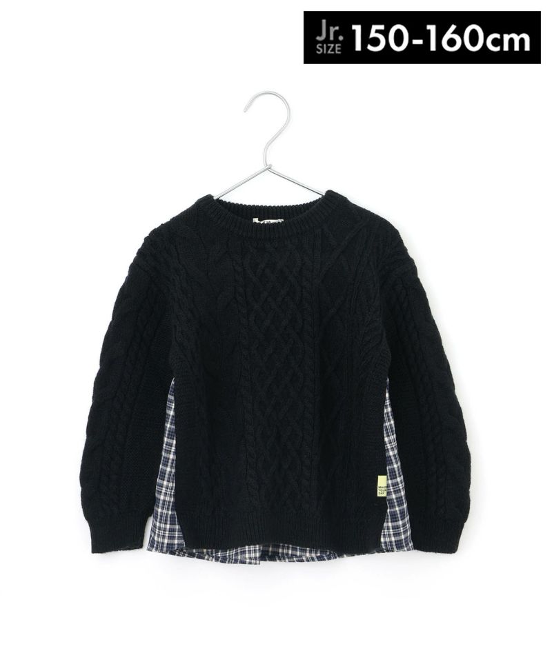 アラン模様のニットと、チェック生地が前後で切り替わっているプルオーバー。