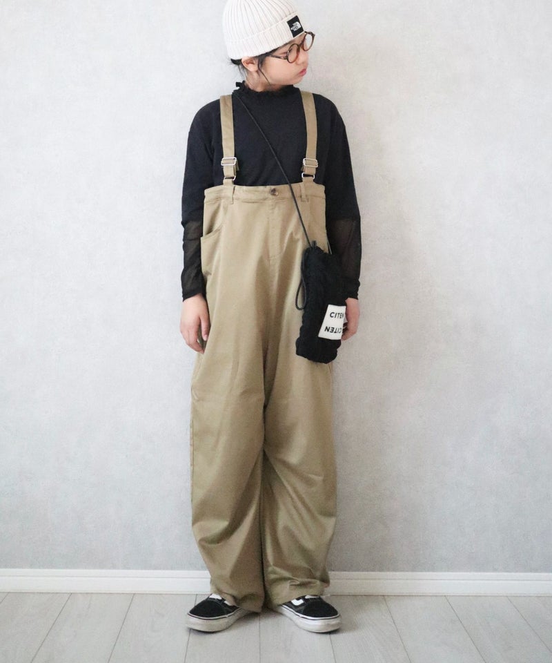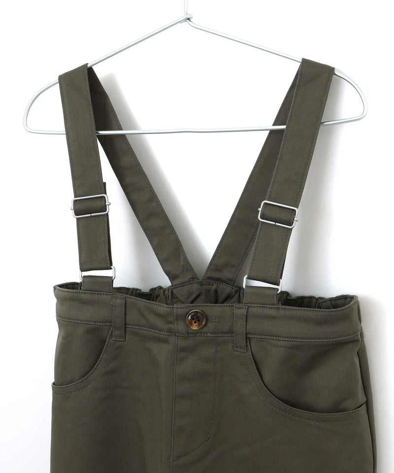 ハイウエストでゆったり着るタイプのサスペンダー付きワイドパンツ。