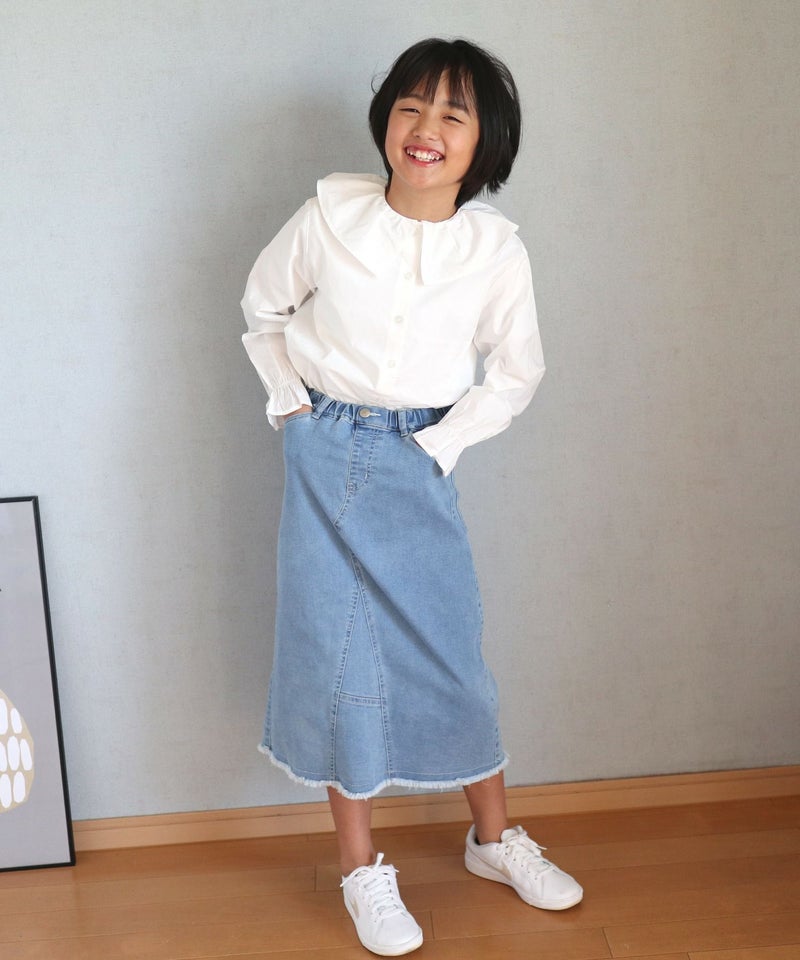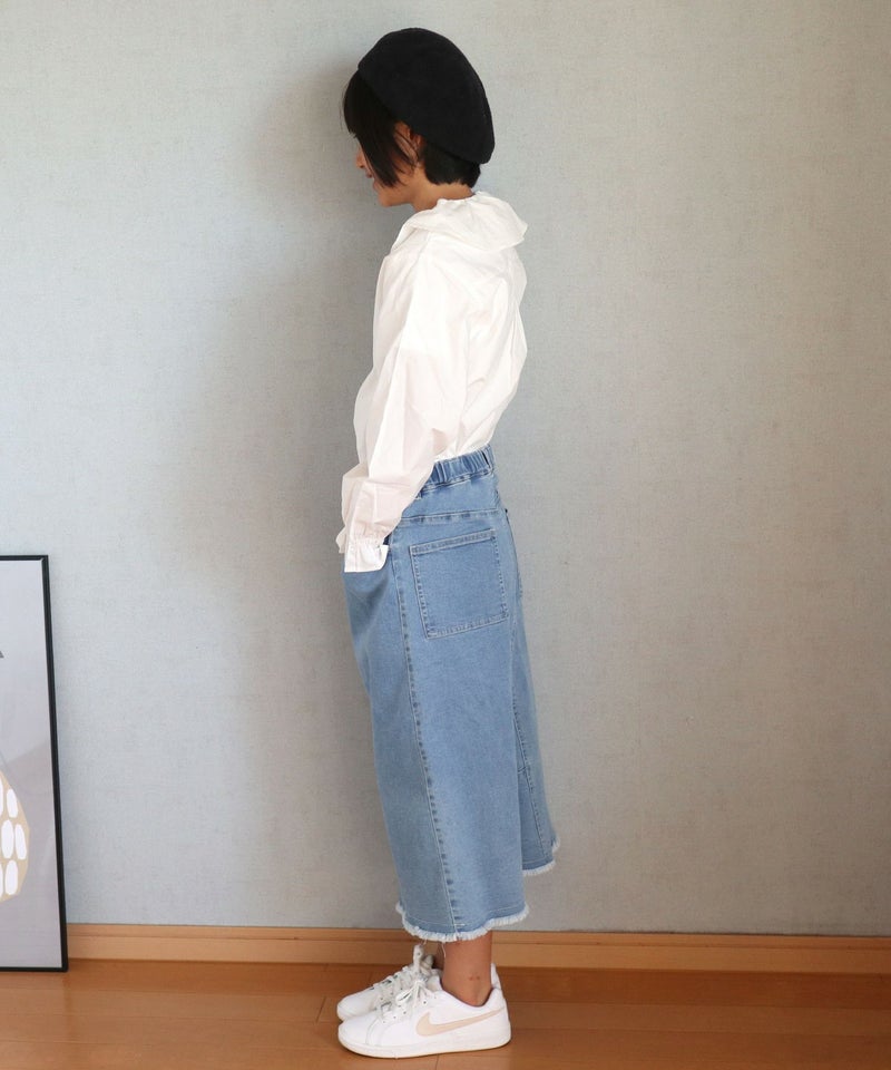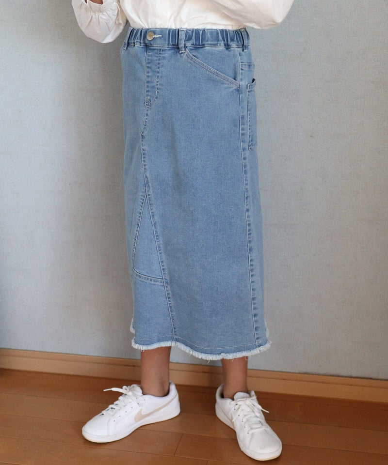 1枚持っていると便利なリメイク風のカジュアルなひざ下丈のスカート。