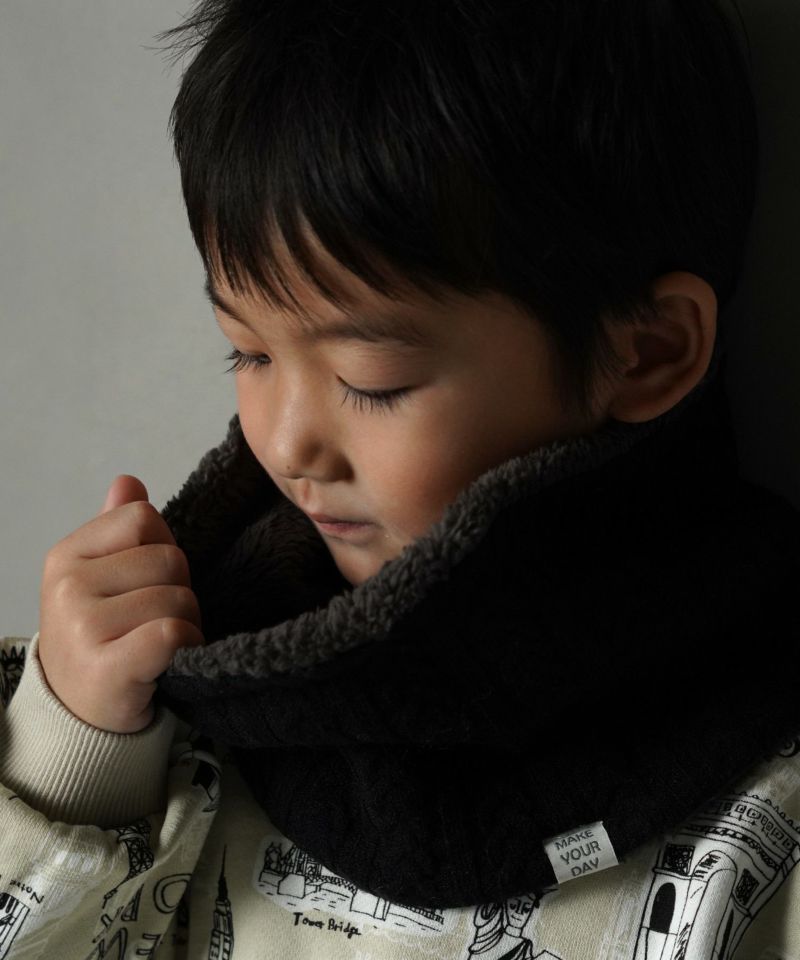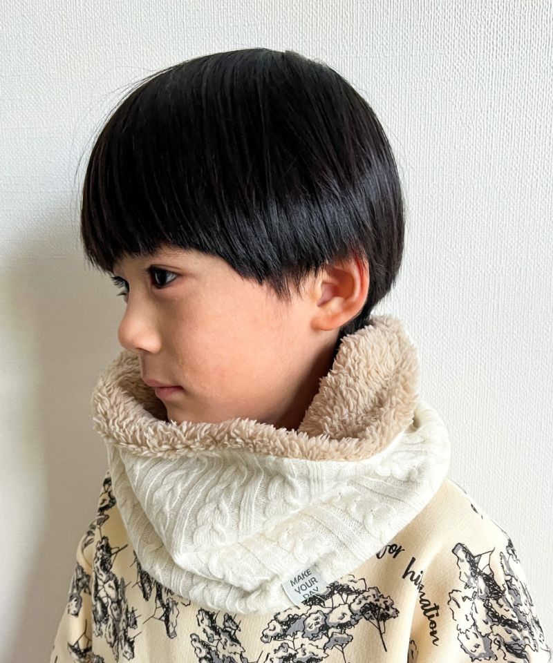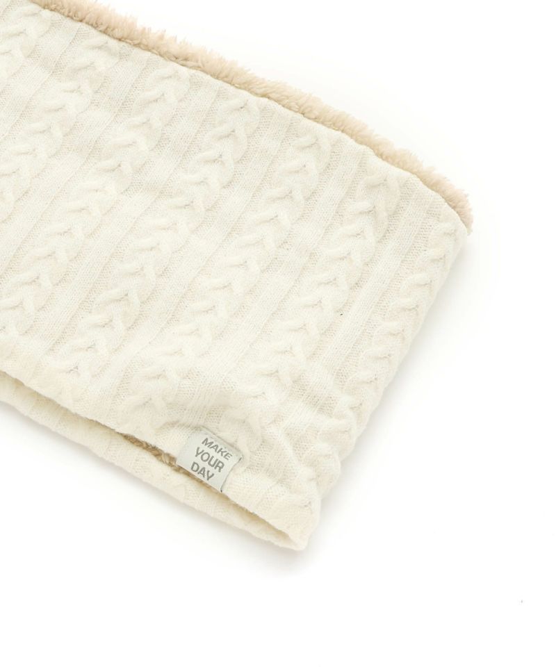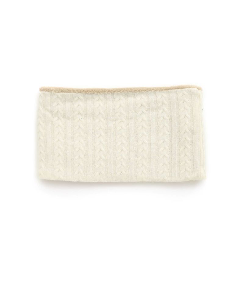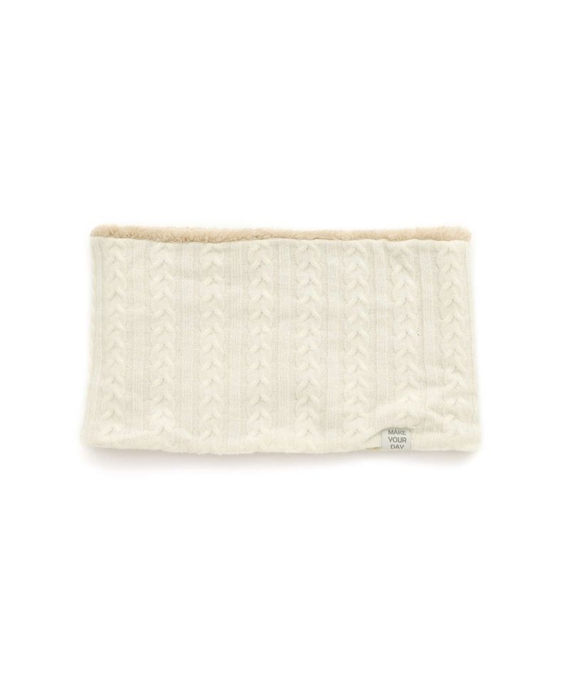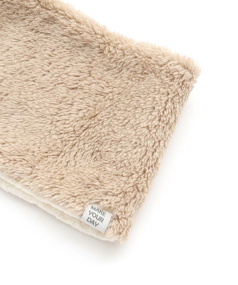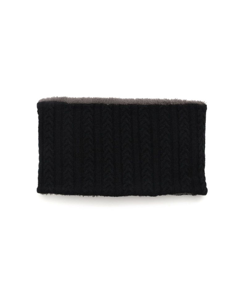 ケーブル編みのニット生地とボア生地でリバーシブルになっているネックウォーマー。