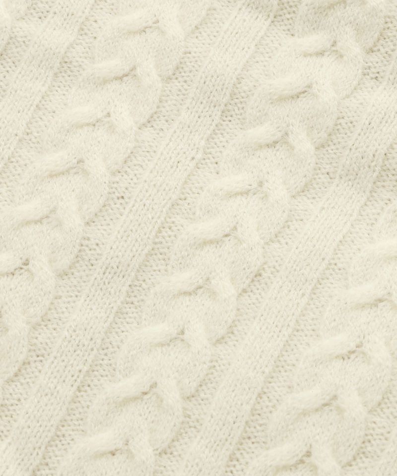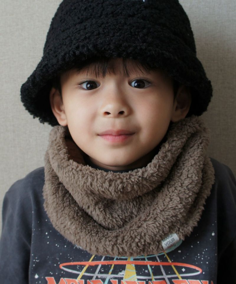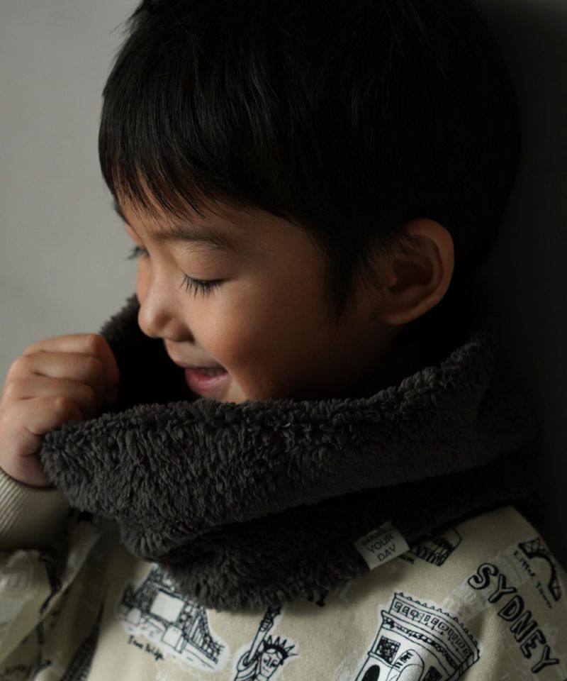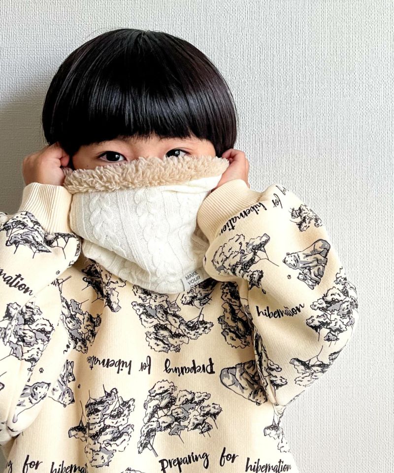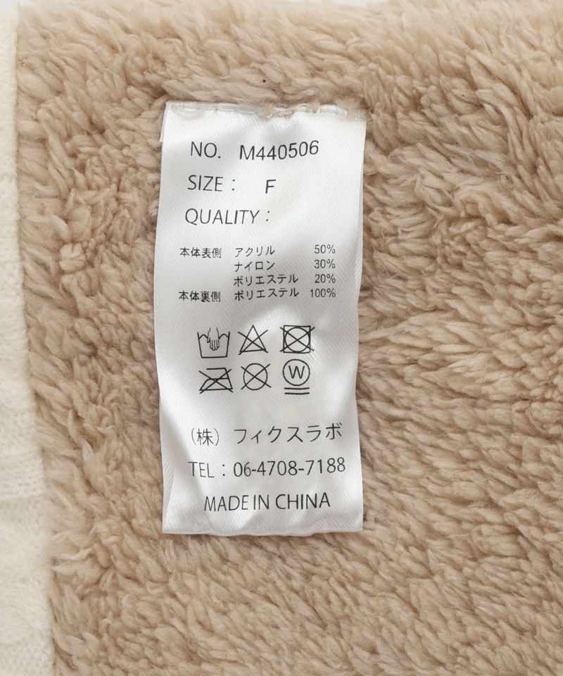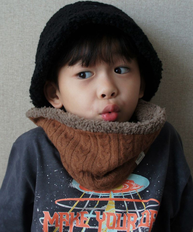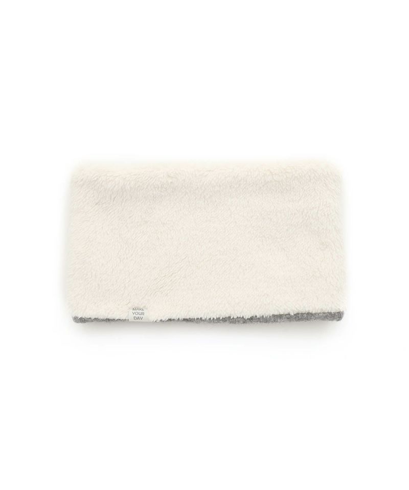 ケーブル編みのニット生地とボア生地でリバーシブルになっているネックウォーマー。