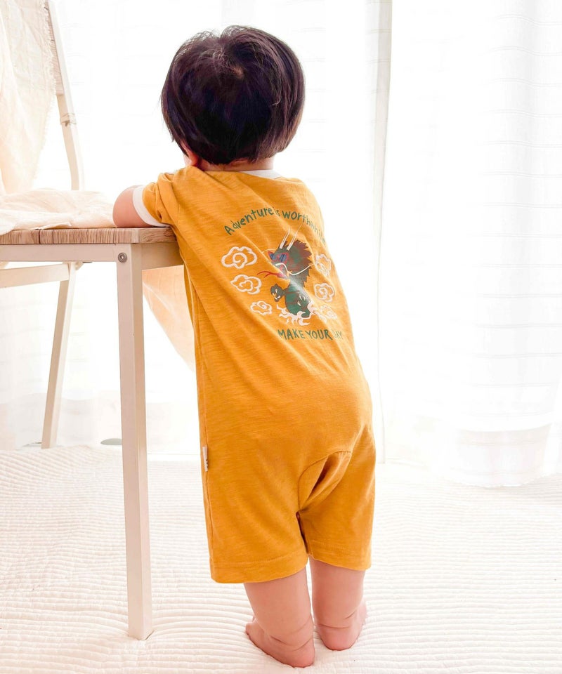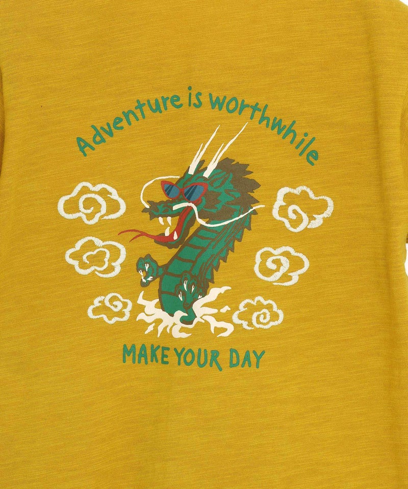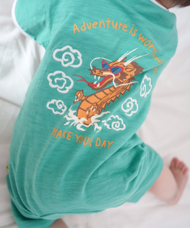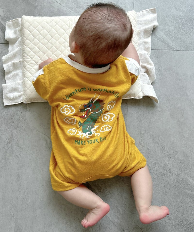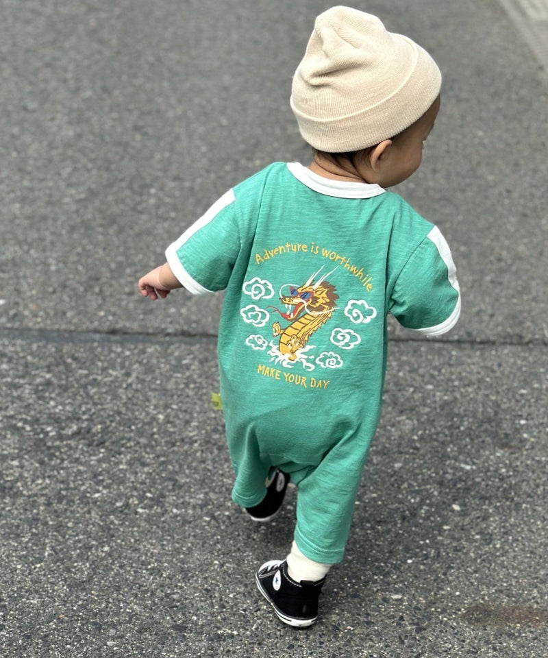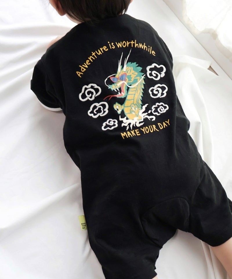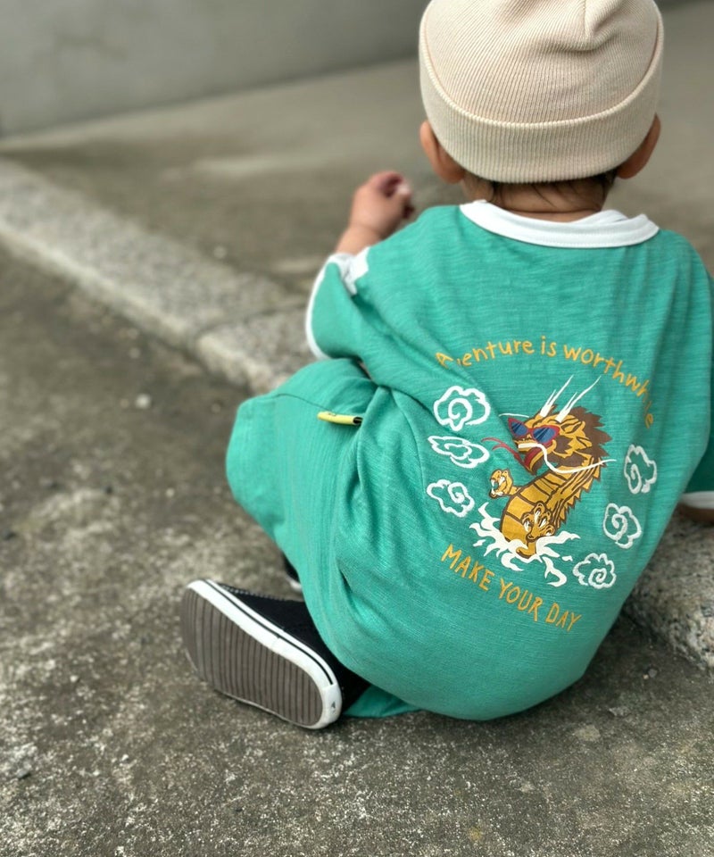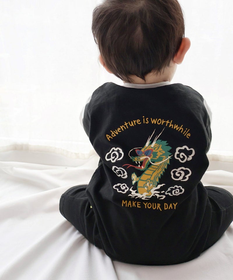 サングラスかけちゃう。雲と一緒に踊っちゃう。そんなファンキーなドラゴンさんを背中に描いたスカジャン風ロンパス。