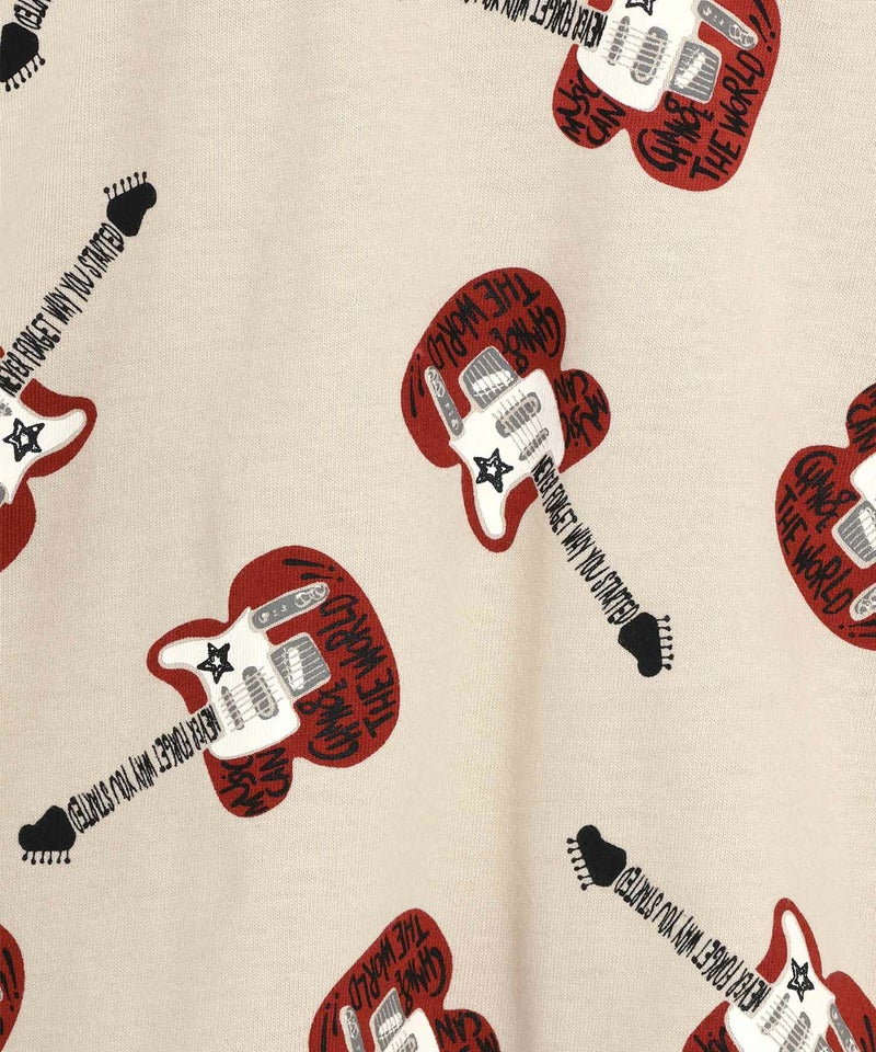 かっこよくなりがちなエレクトリックなギターを、メイクユアデイらしくすこしゆるいテイストで仕上げた総柄ロンTです。