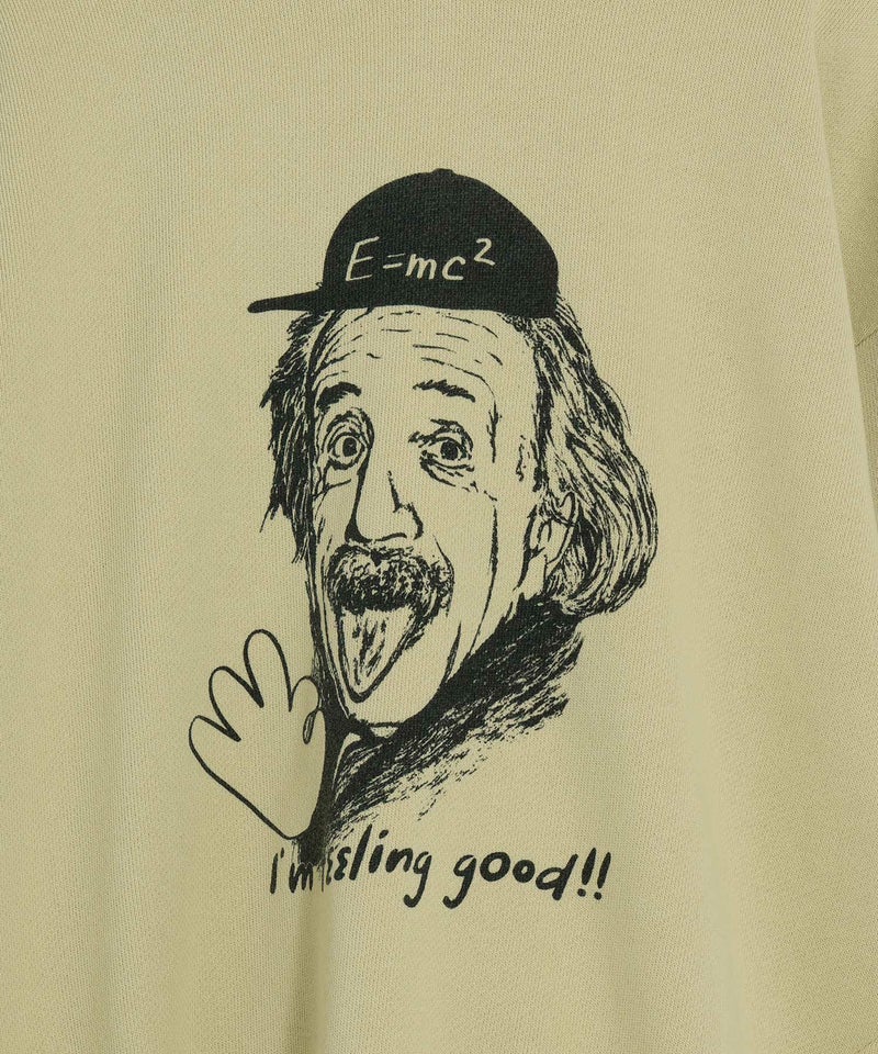 おどけた表情の有名なあのアインシュタインを、メイクユアデイのゆるーいタッチで描いたフーディ。
