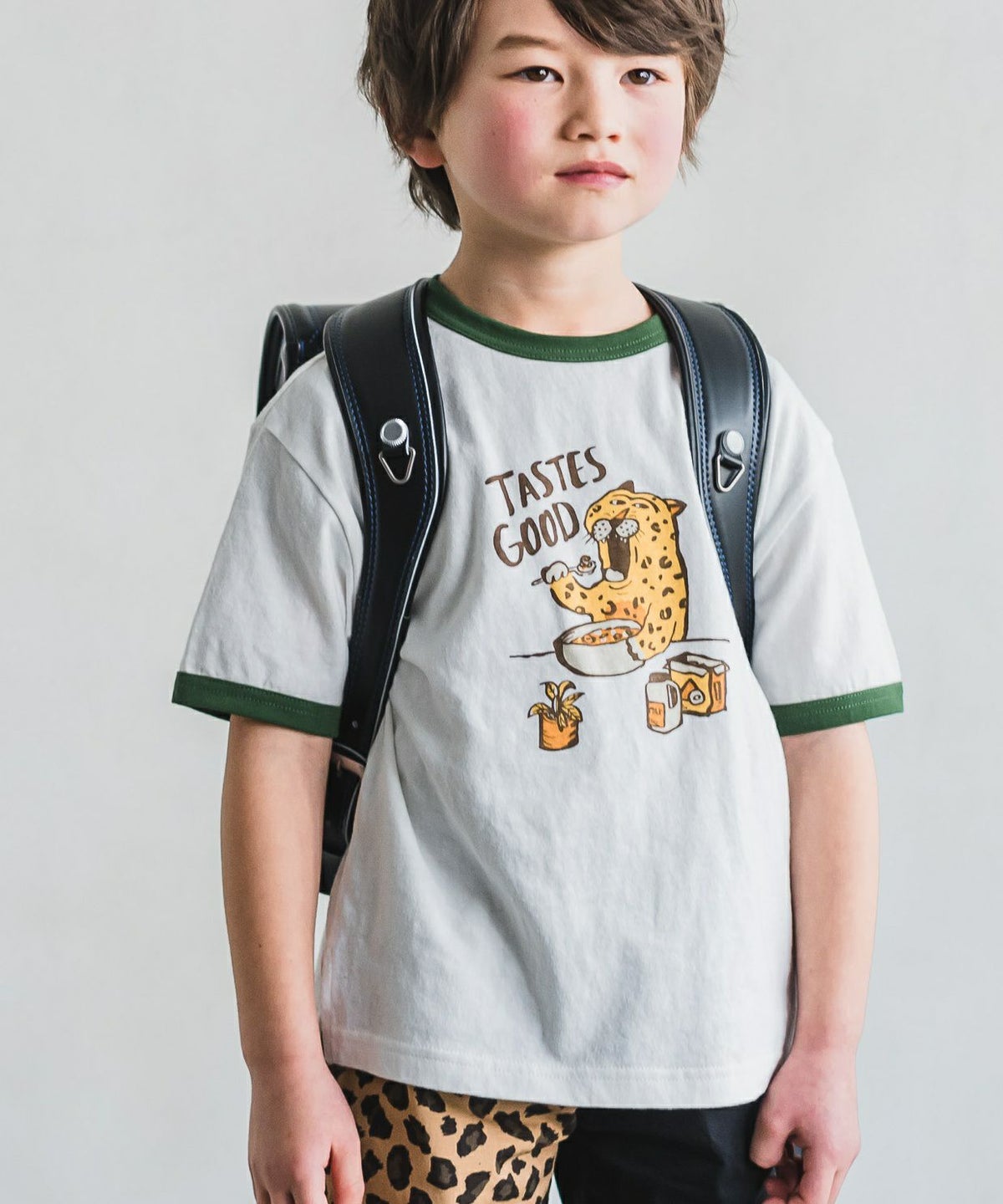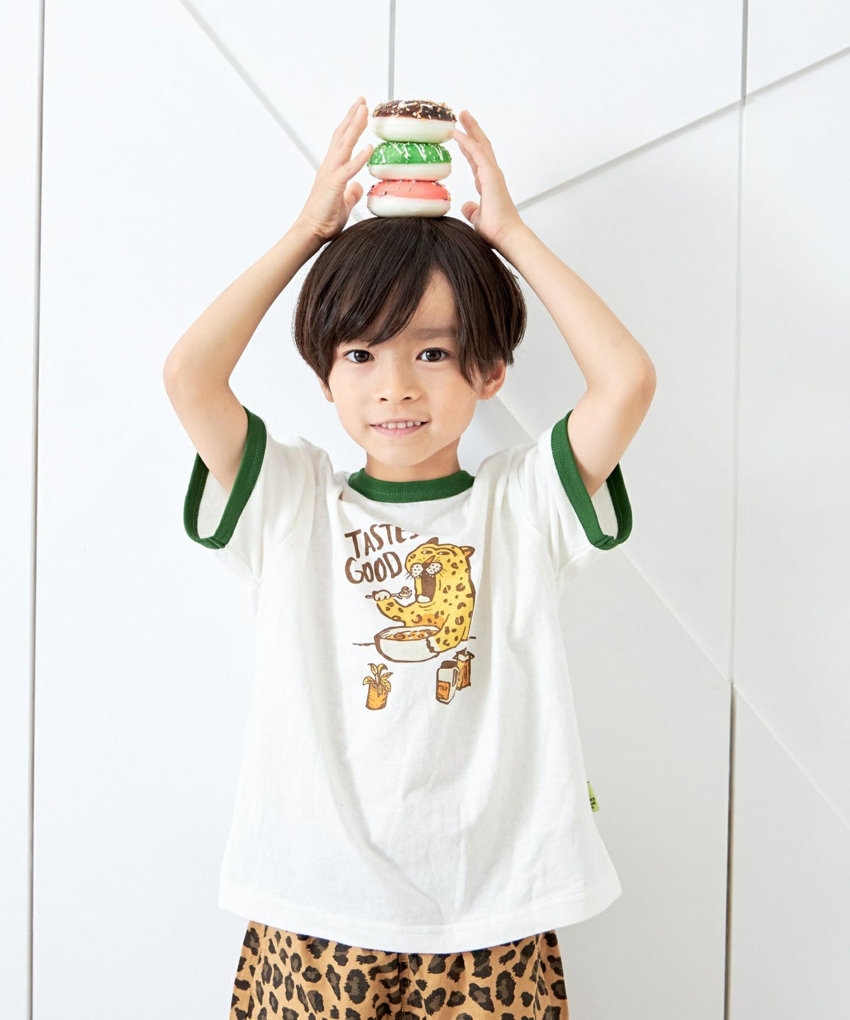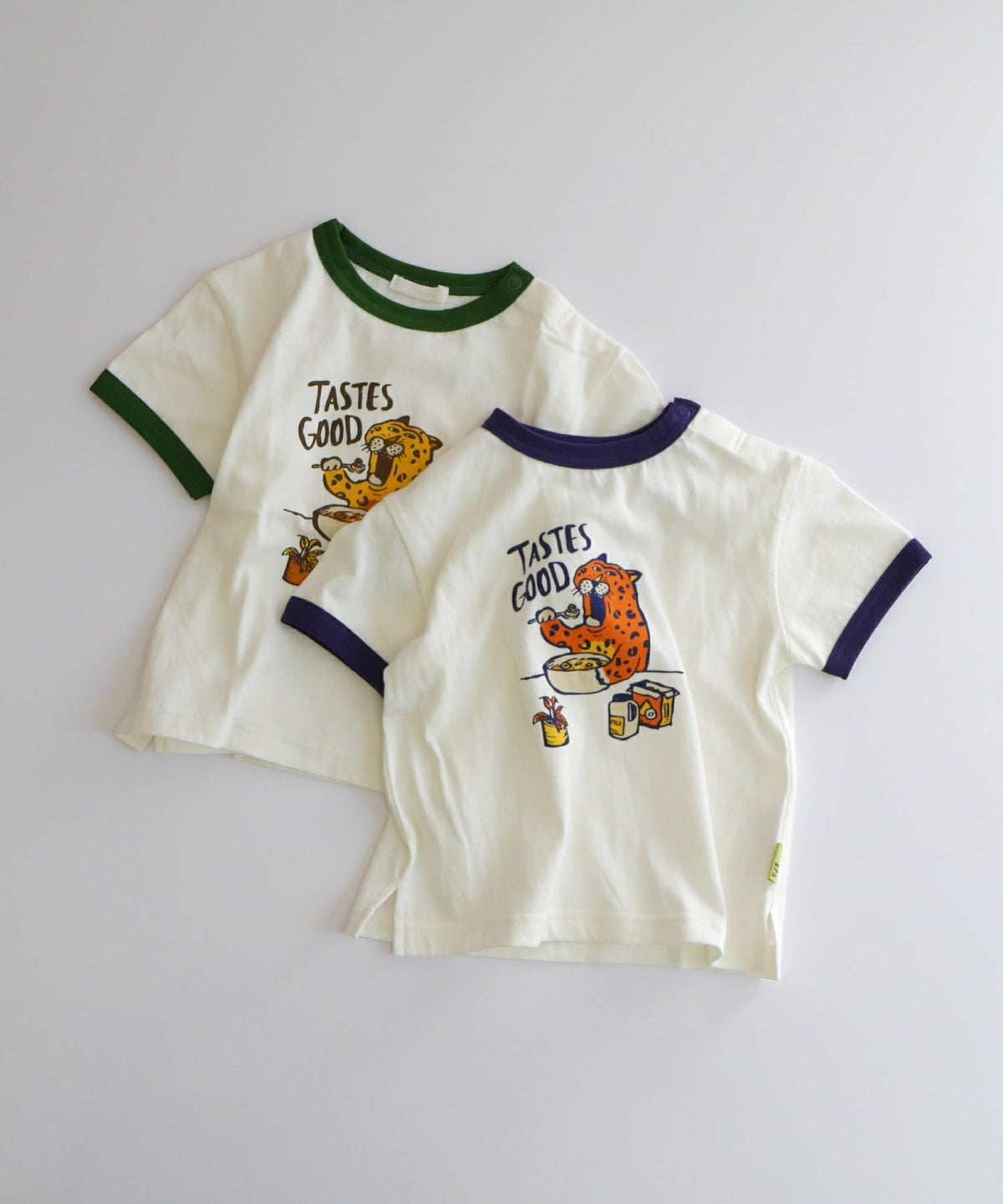 【セール】ヒョウの朝ごはんリンガー半袖Tシャツ■80~140cm