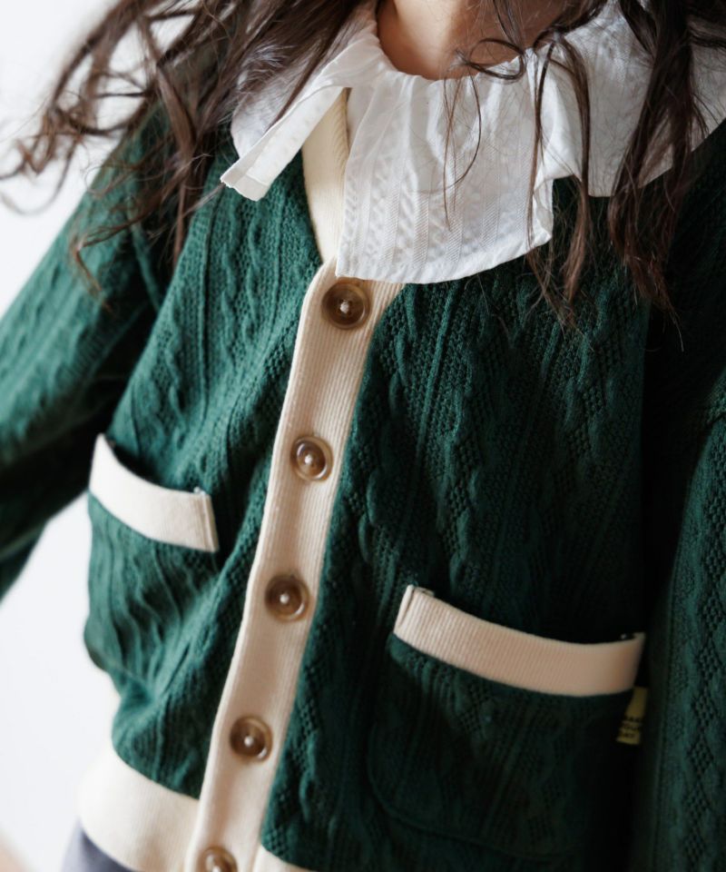 ケーブル模様と落ちついた組み合わせのバイカラーが、”ええとこの子”感あふれています。