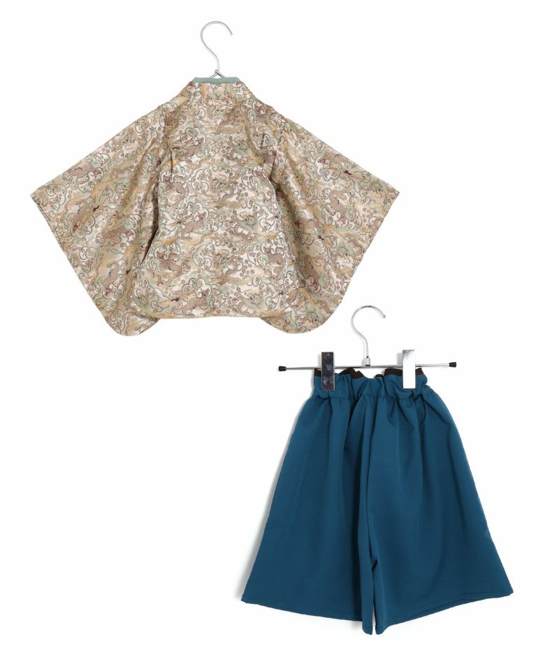 落ち着いた大人っぽい和柄の羽織と、十文字の前紐がかっこよく、まるで大人の袴を着せているようなデザイン。