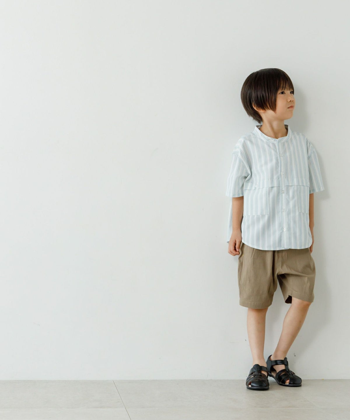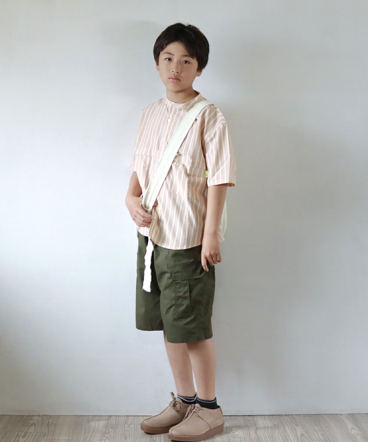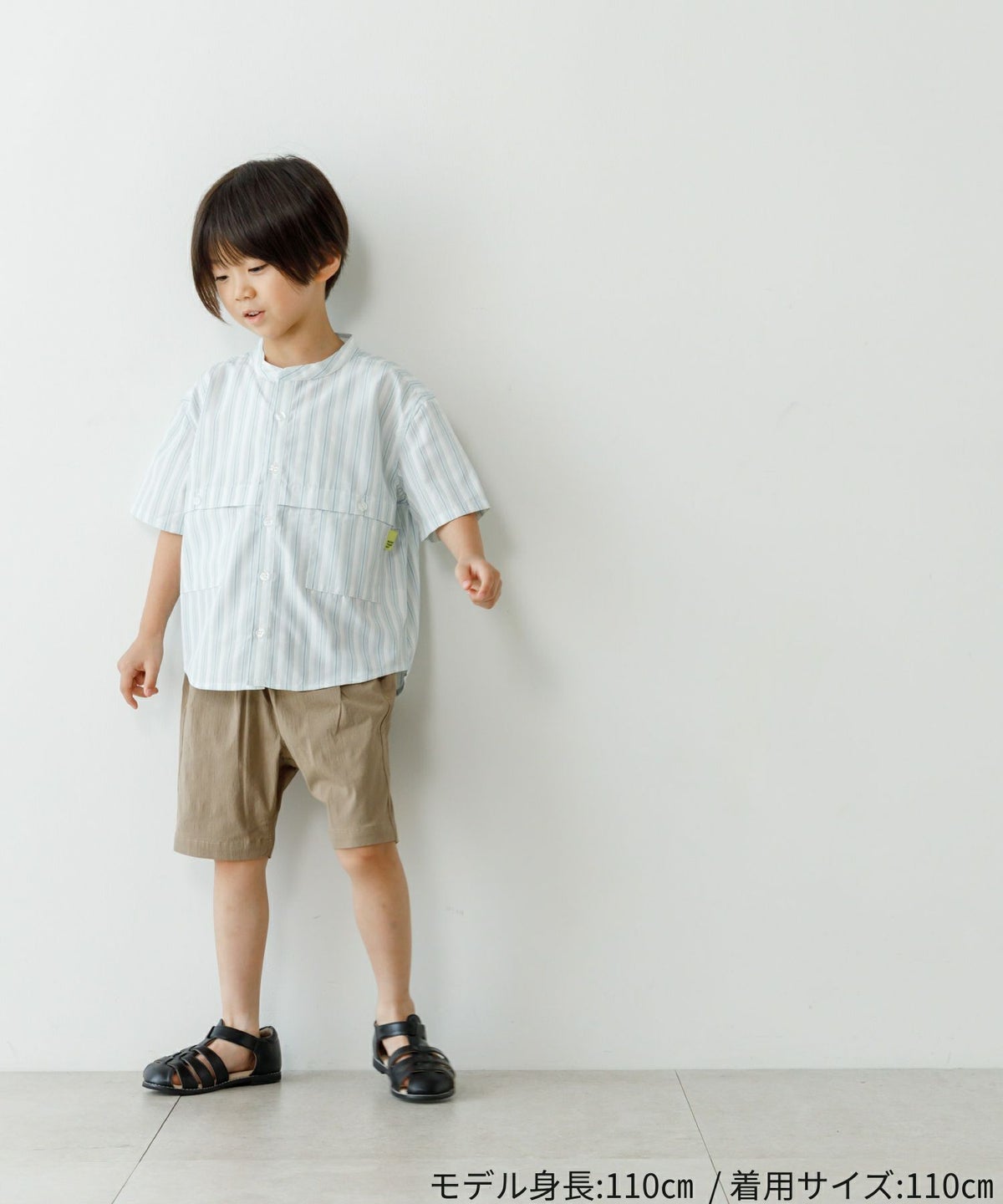 【セール】マルチストライプ半袖バンドカラーシャツ■150.160cm