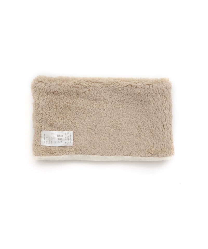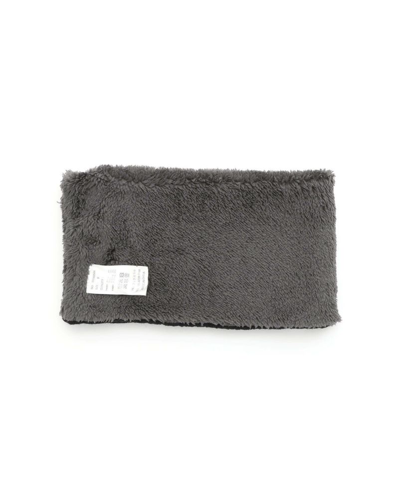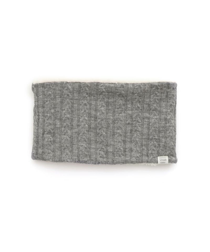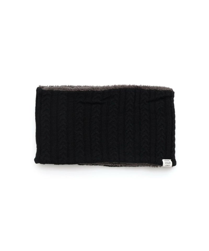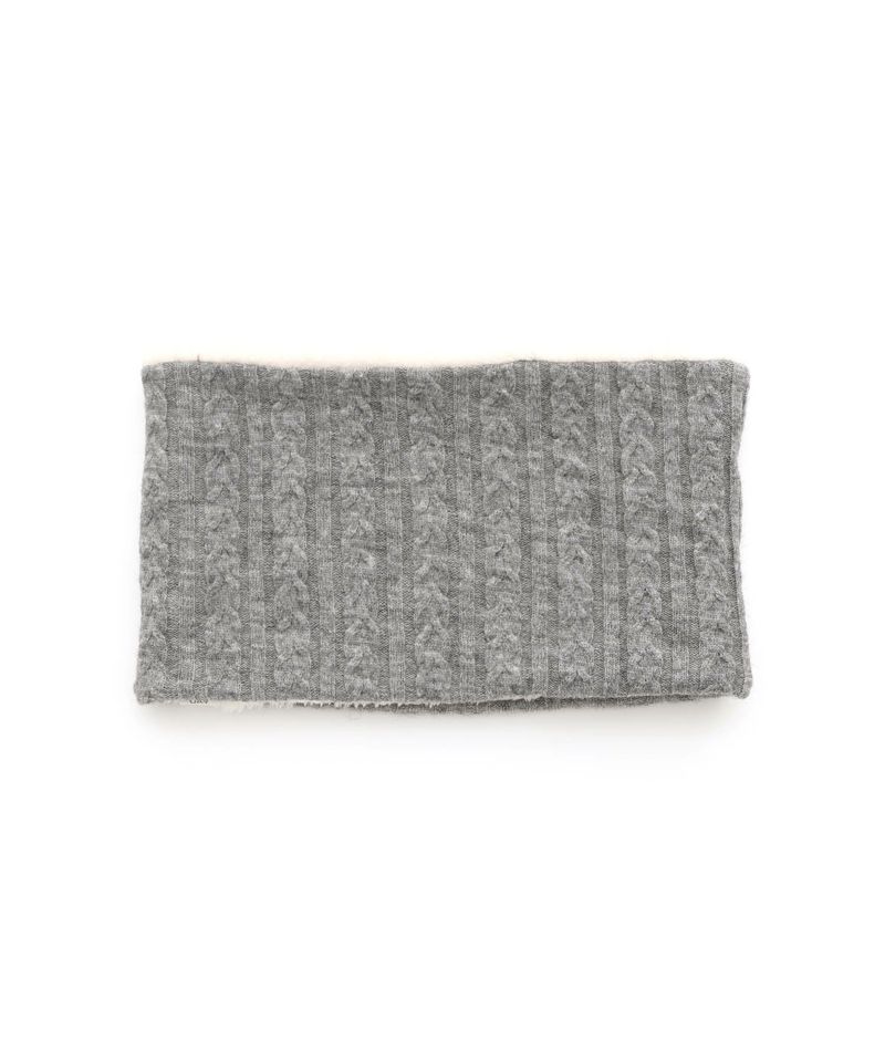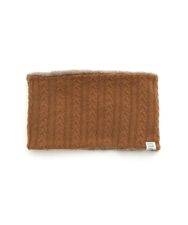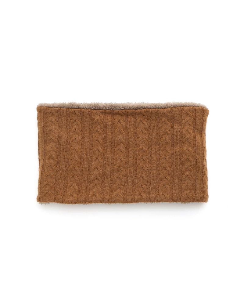 ケーブル編みのニット生地とボア生地でリバーシブルになっているネックウォーマー。