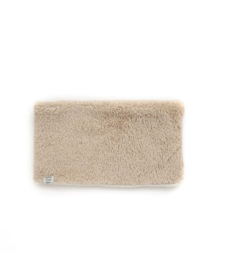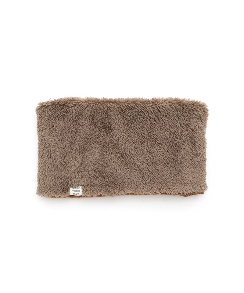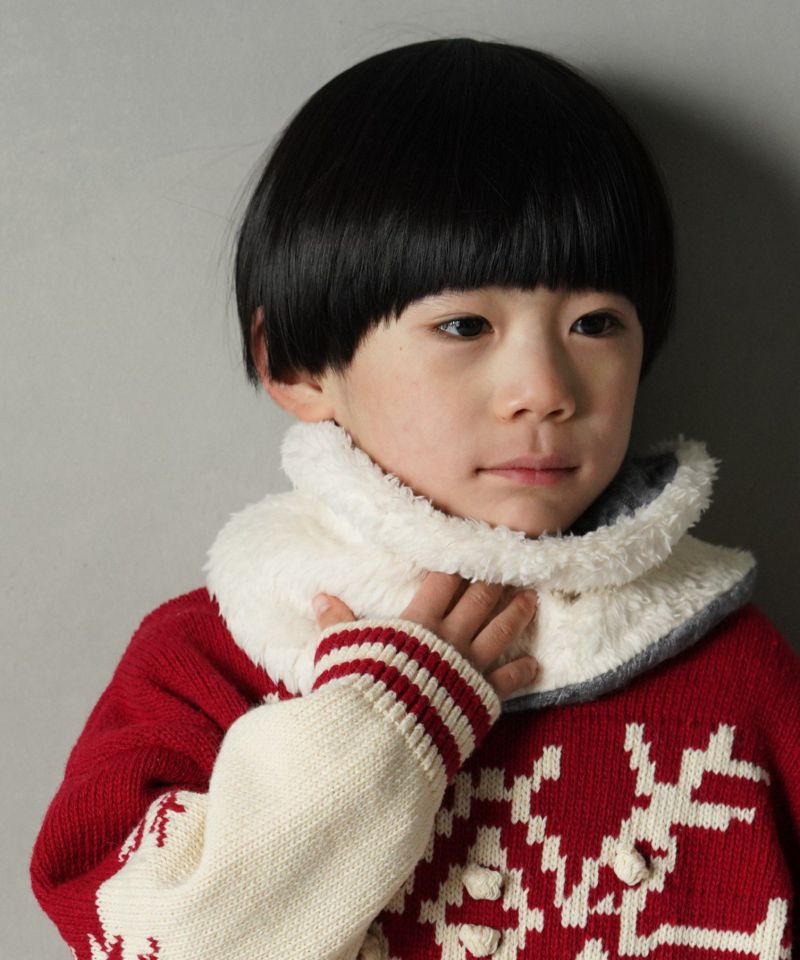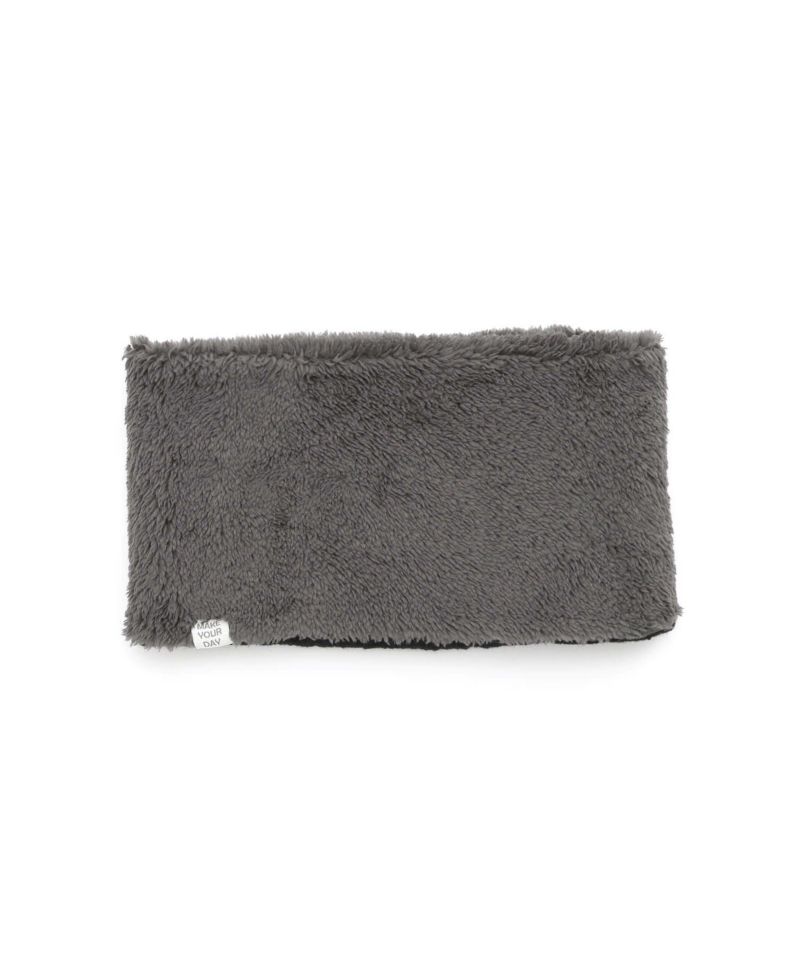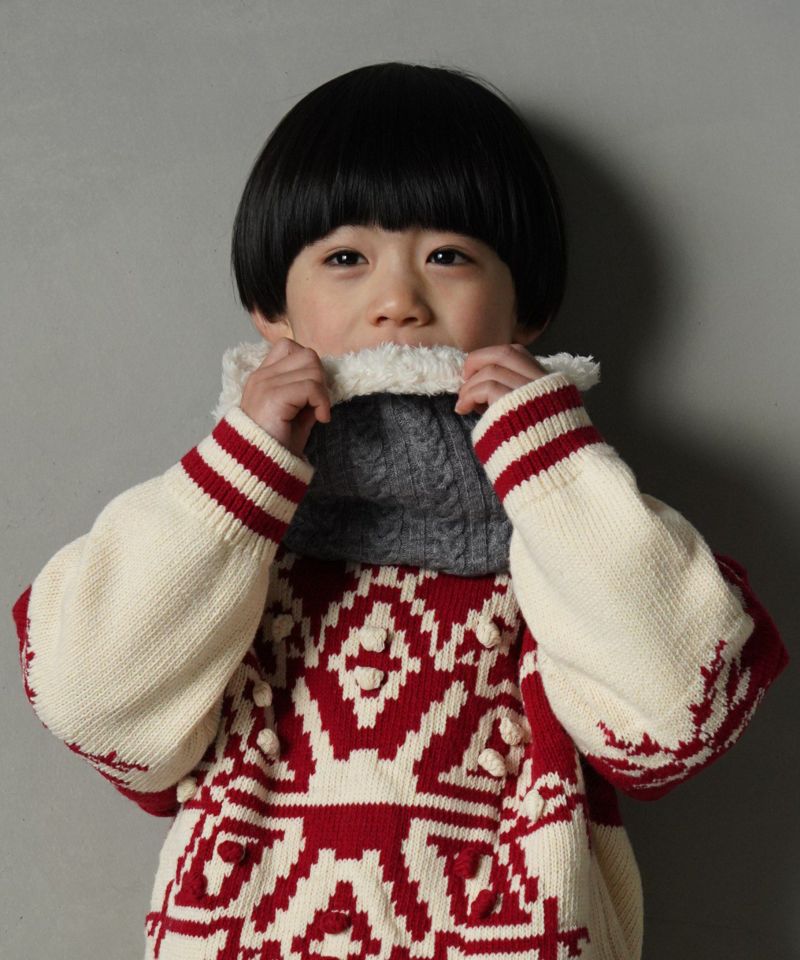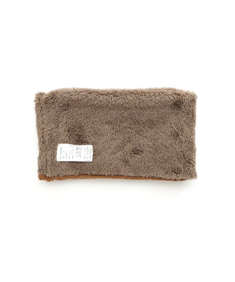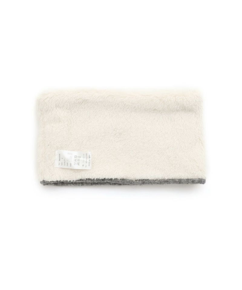 ケーブル編みのニット生地とボア生地でリバーシブルになっているネックウォーマー。