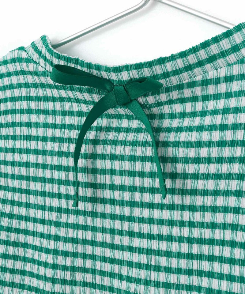 首元後ろの飾りリボンや、メロウ処理された裾などかわいらしいディテールもたっぷり◎