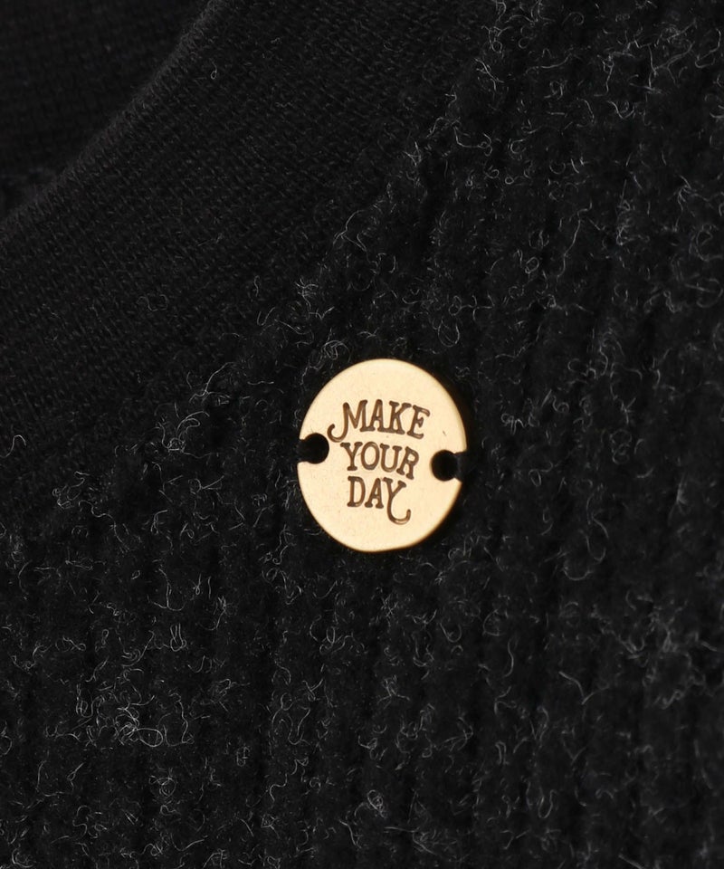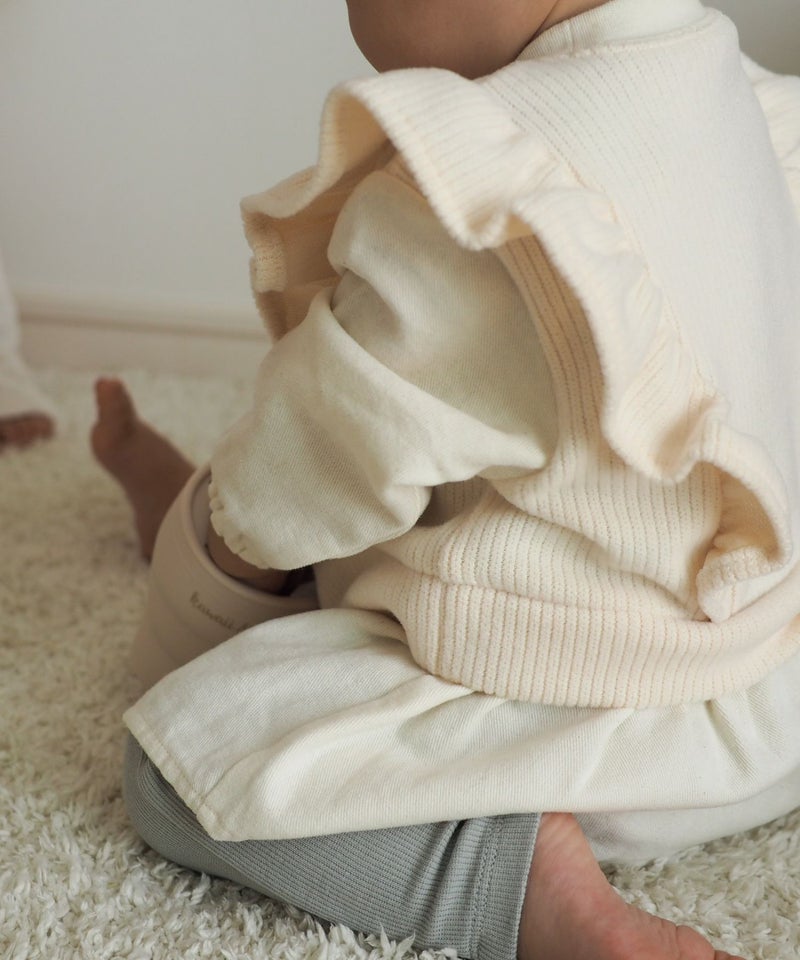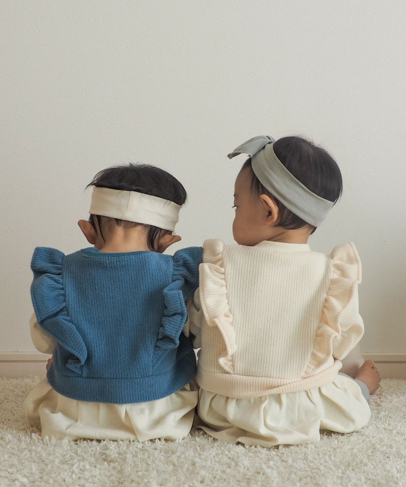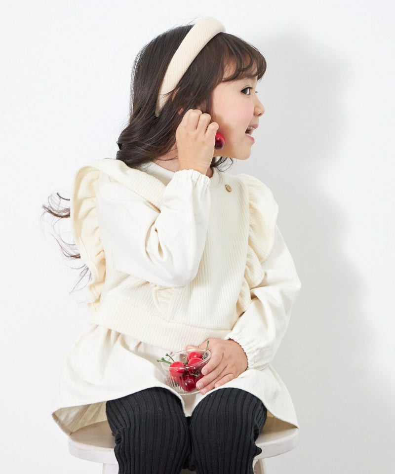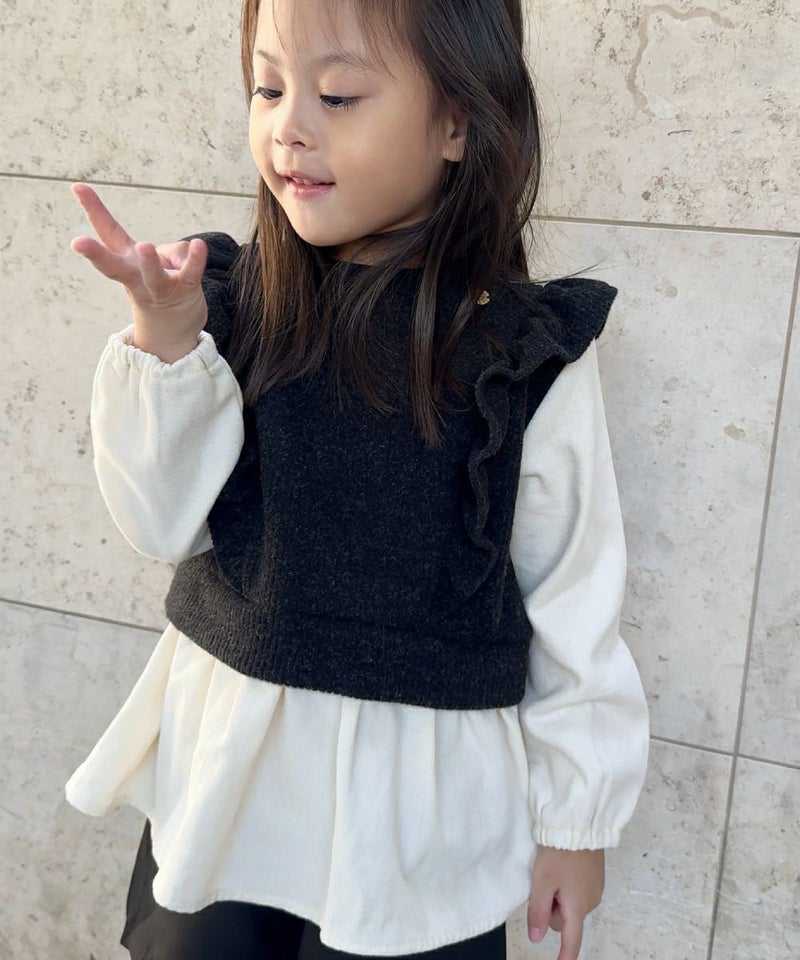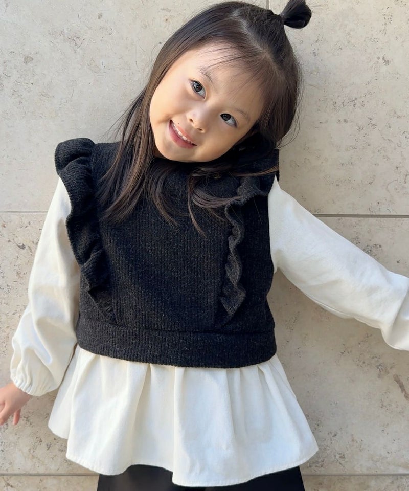 フリルのついたニットベストのレイヤードスタイルを1枚で完結!