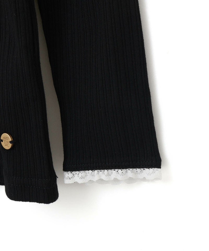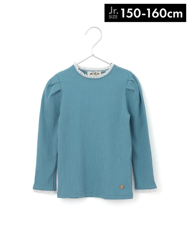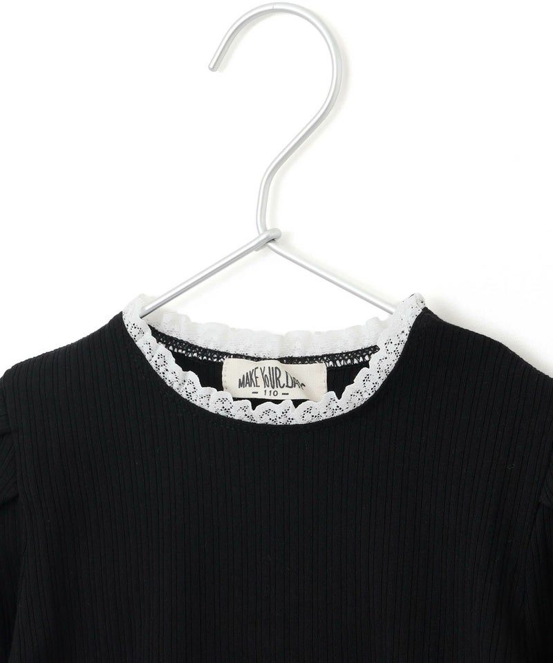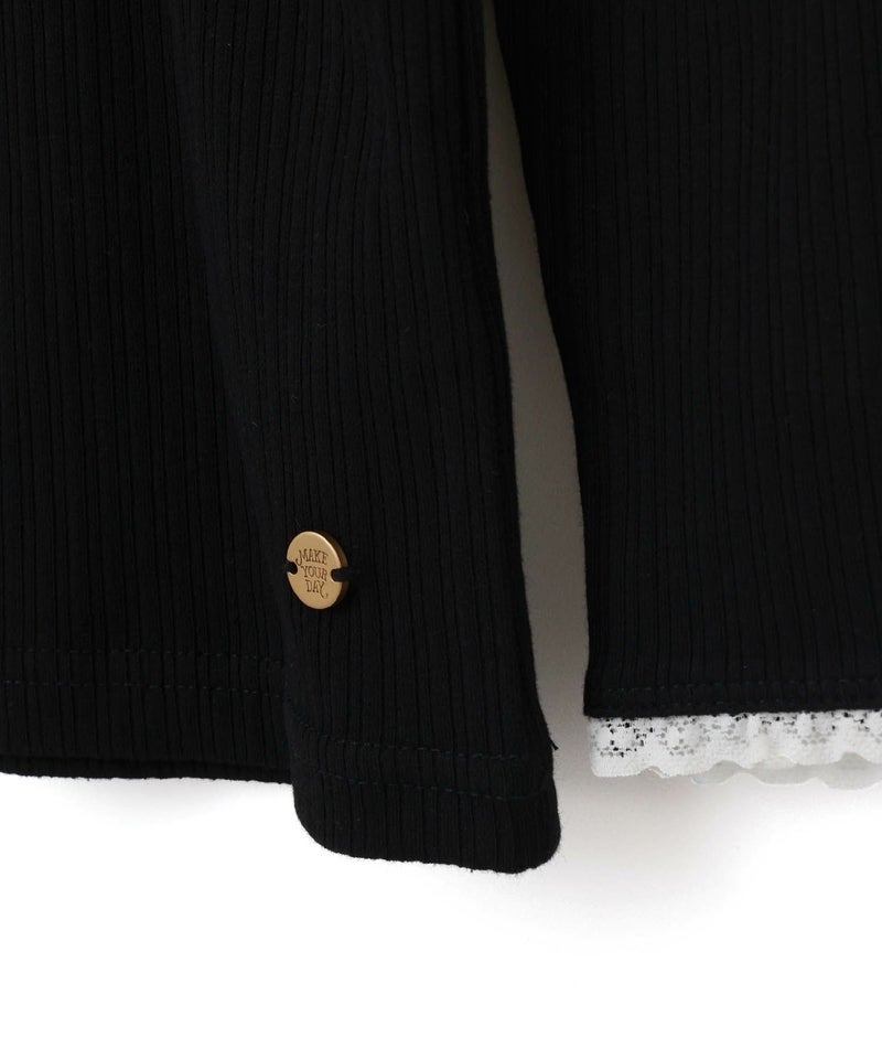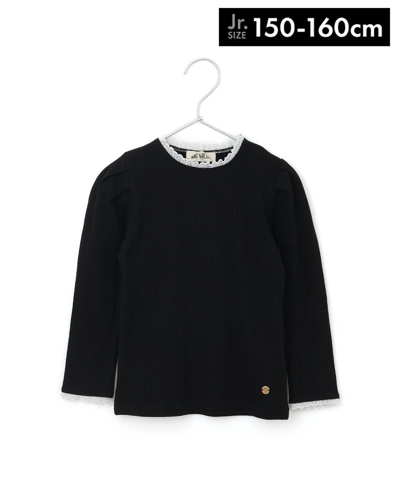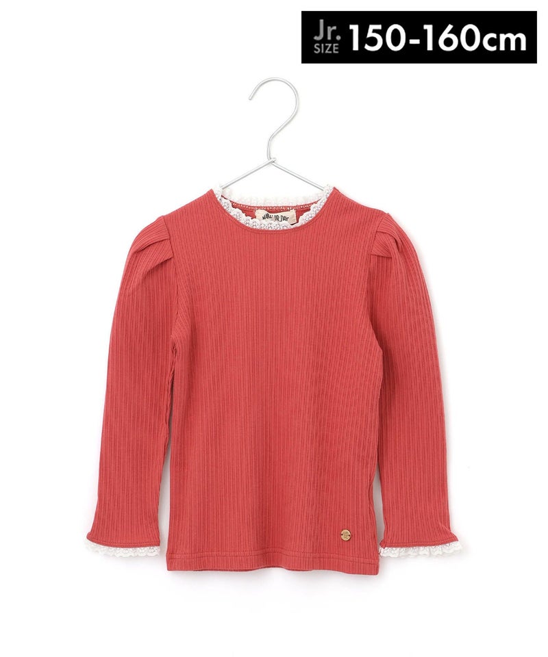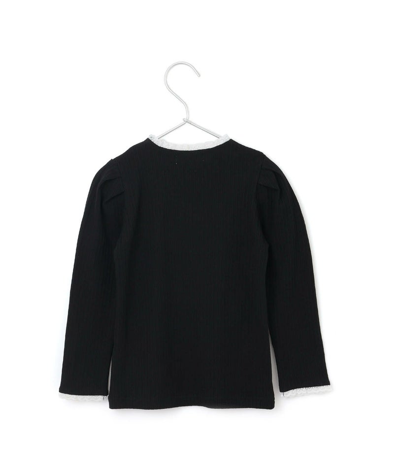 レイヤード風のフリルが首元と袖口をいろどるテレコリブの長袖Tシャツ。