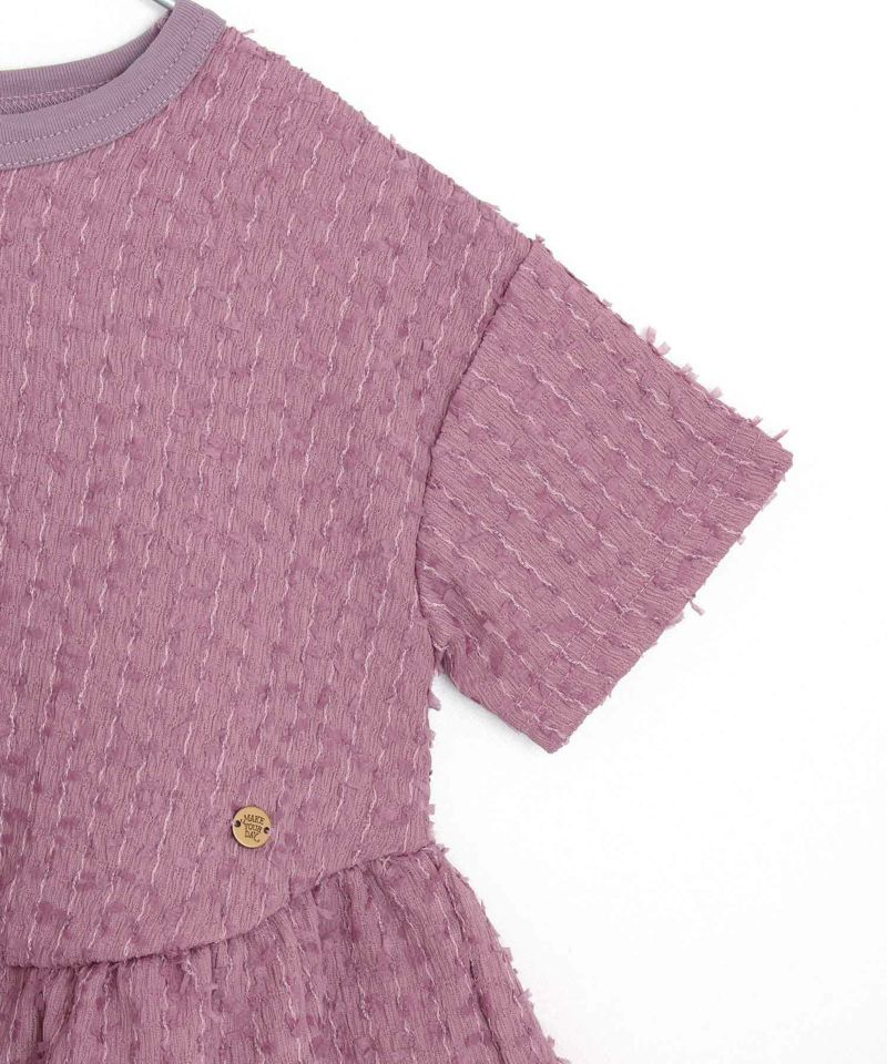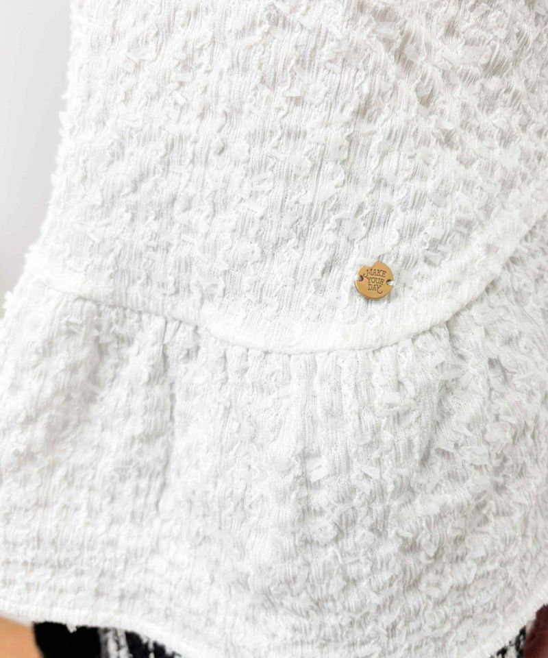 ファンシーヤーンのふさふさがかわいいジャガード素材でできたペプラムシルエットの半袖Tシャツ。