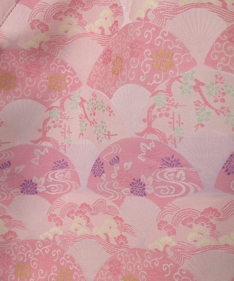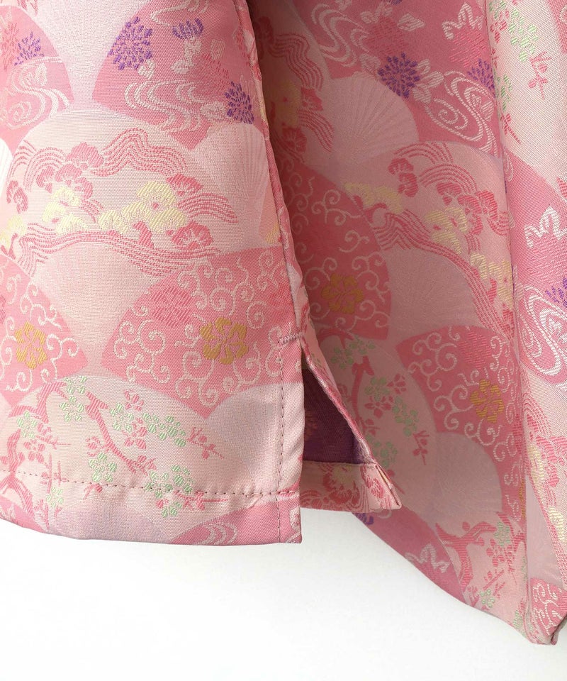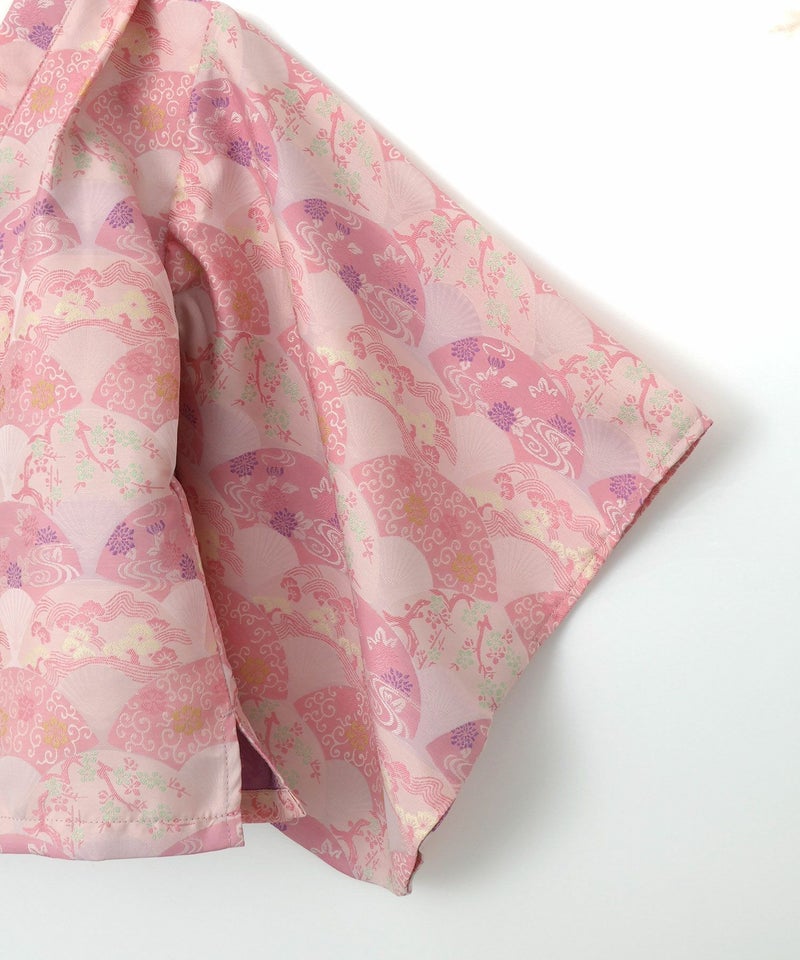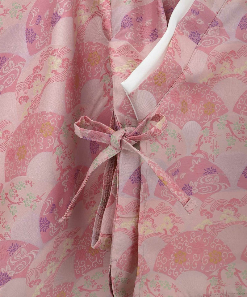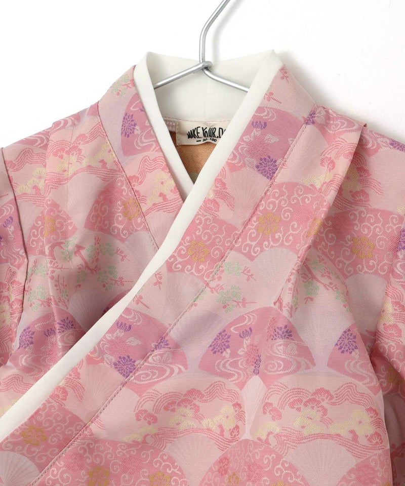 しっかりインパクトのある柄の羽織と、ウエストは本格的な和装の結びでかっこよく、まるで大人の袴を着せているようなデザイン。