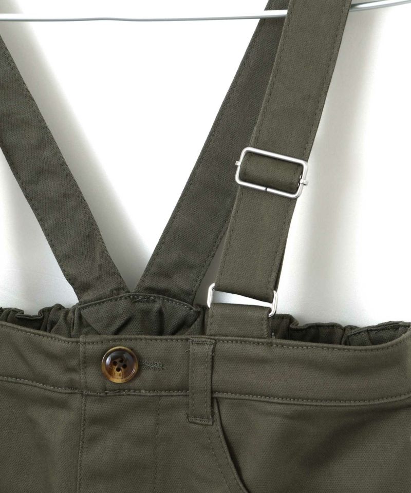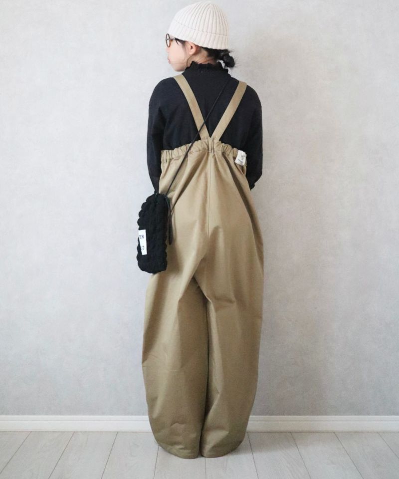 ハイウエストでゆったり着るタイプのサスペンダー付きワイドパンツ。