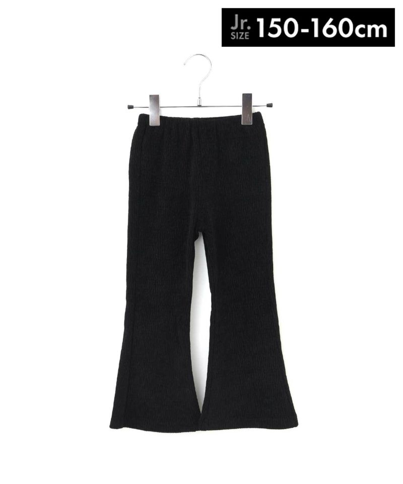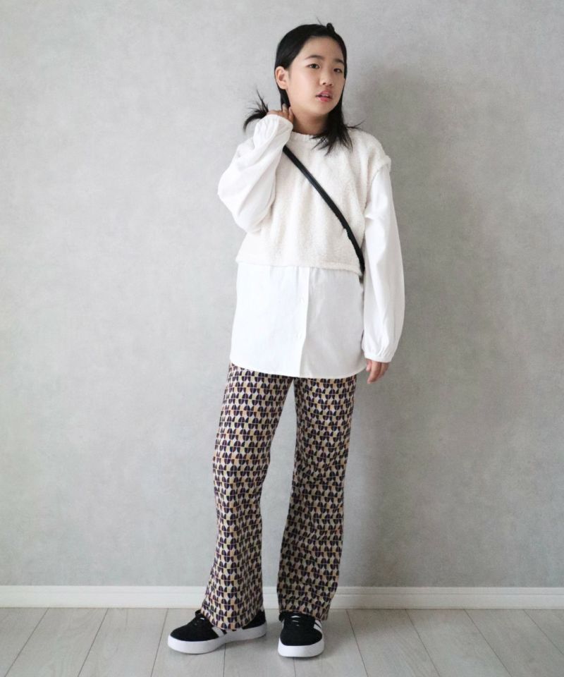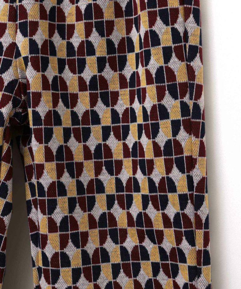 今季トレンドの光沢感と凹凸感のあるベロア素材と、レトロな幾何学柄を使用したフレアパンツ。