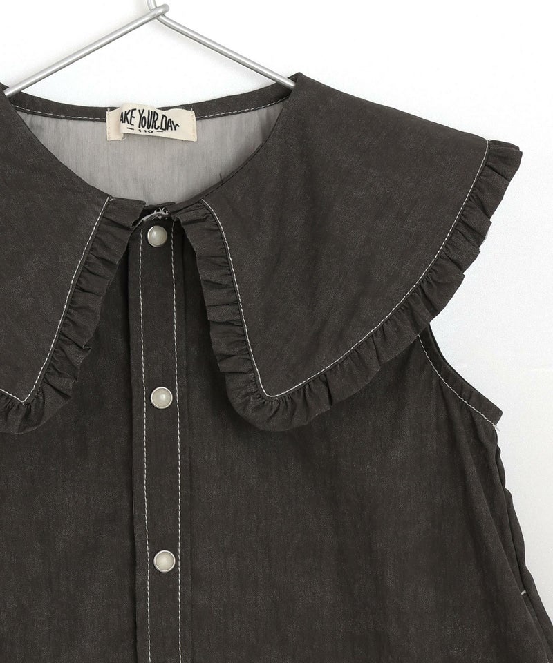 フリルのついた大きな襟がアクセントになったデニムワンピース。