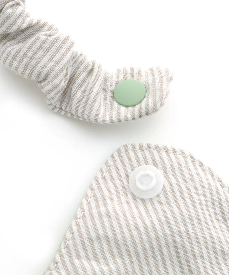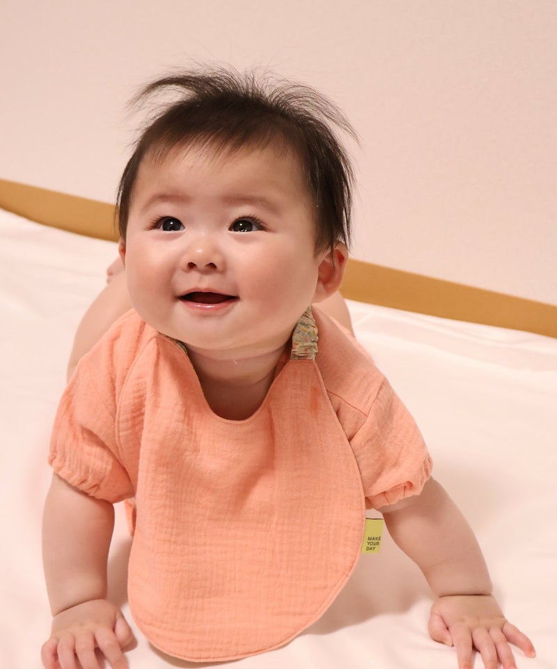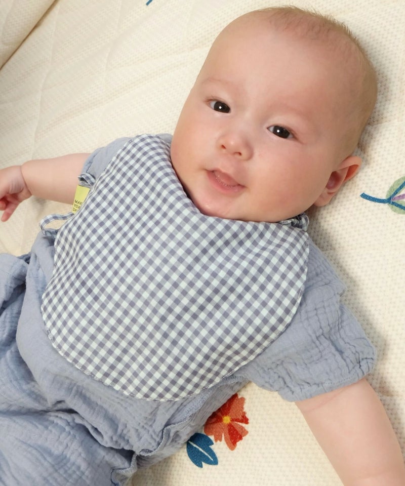 肌触りのいいWガーゼと、優しい柄のリバーシブルで使えるスタイ。
