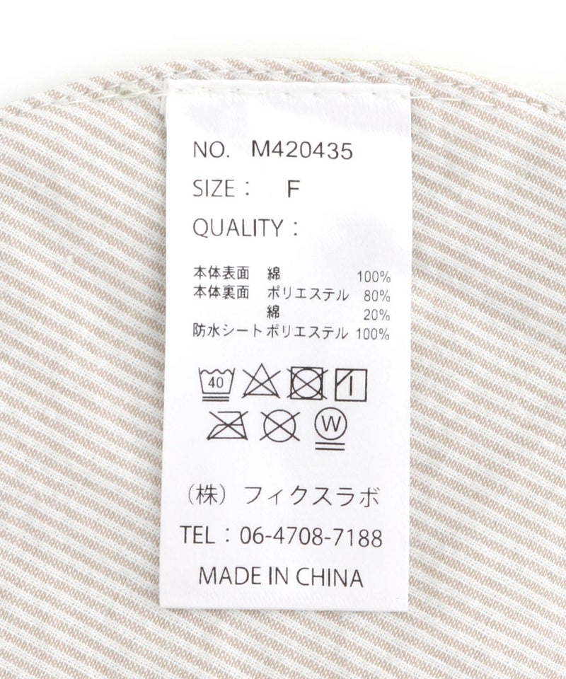 ライム●本体)綿100% 本体裏側)綿20% ポリエステル80% 防水シート部分)ポリエステル100% ピンク●本体・本体裏側)綿100% 防水シート部分)ポリエステル100% サックス●本体)綿100% 本体裏側)綿30% ポリエステル70% 防水シート部分)ポリエステル100%