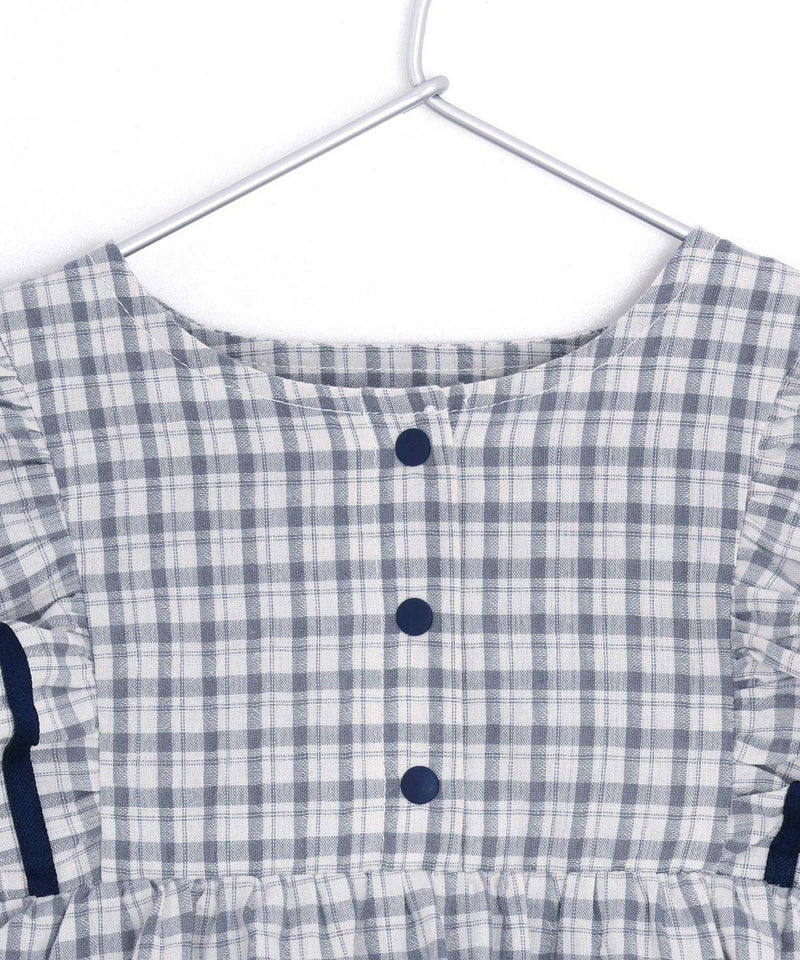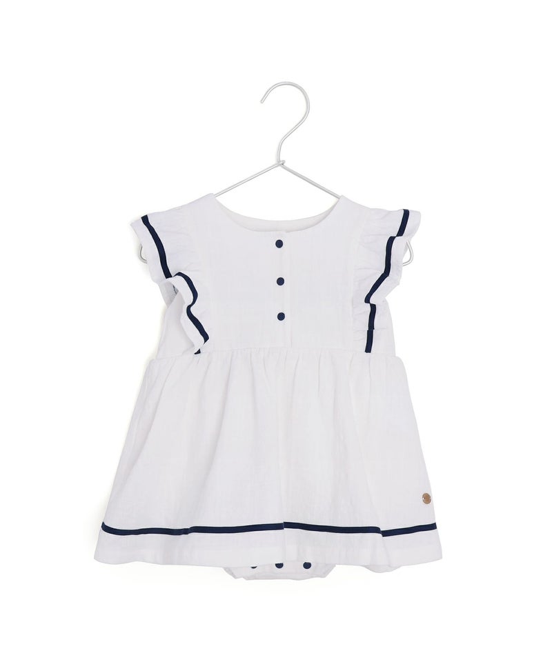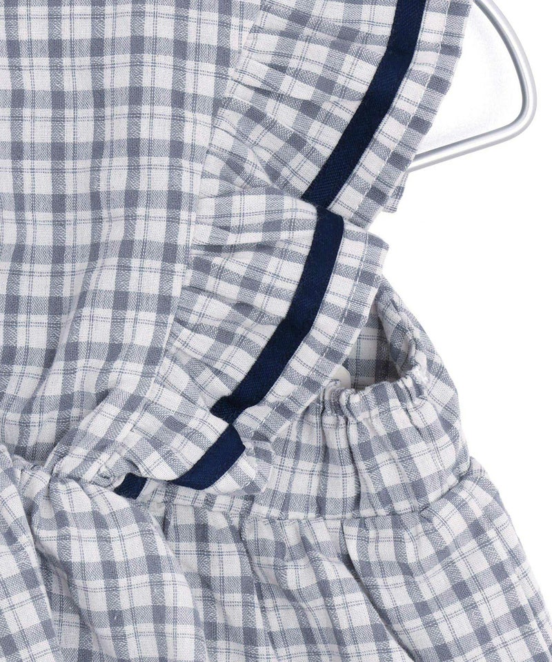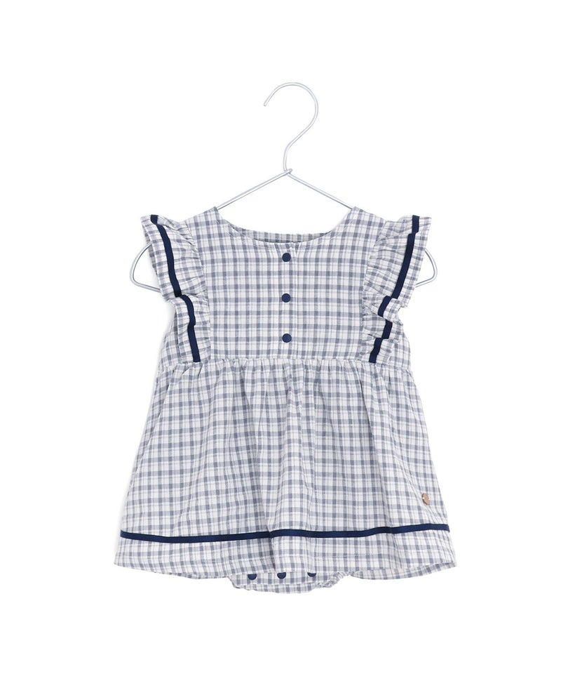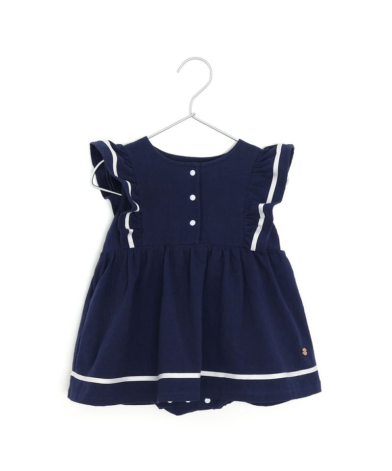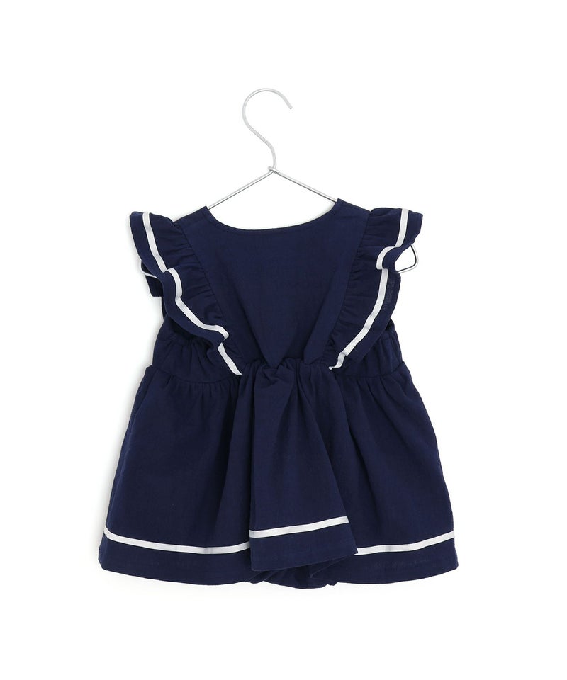 セーラー風のデザインのフリルが夏らしいかわいいロンパース。