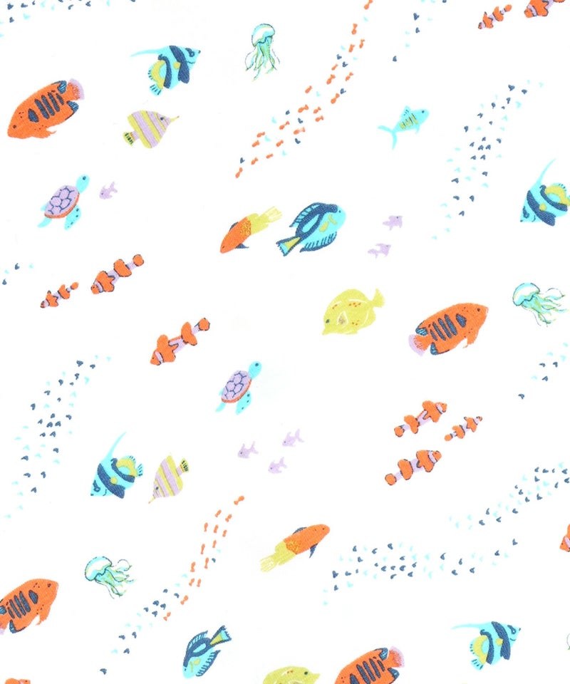 オレンジはおさかな柄、サックスは花火柄、イエローはひまわり柄です。