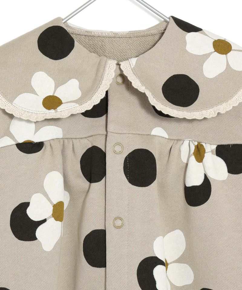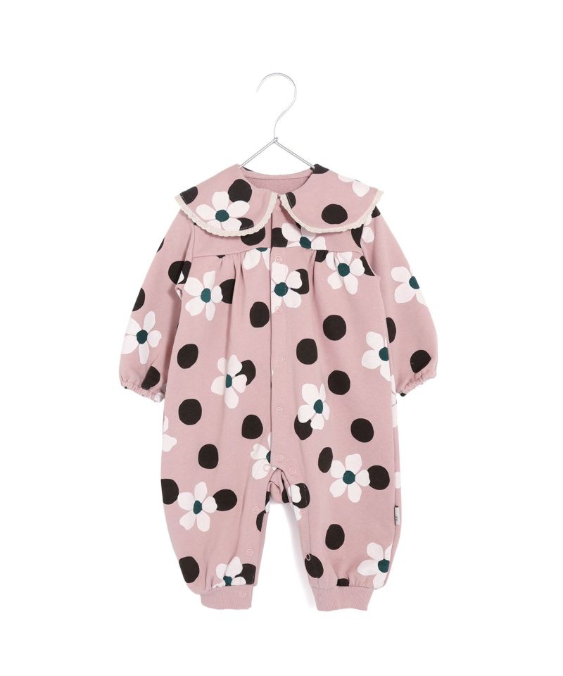 大きなお花と大きなドットを組み合わせて、さらに大きな衿がかわいいカバーオール。