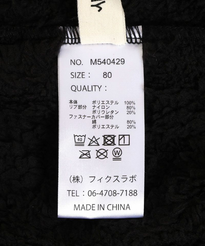 本体)ポリエステル100% リブ部分)ナイロン80% ポリウレタン20% ファスナーカバー部分)綿80% ポリエステル20%