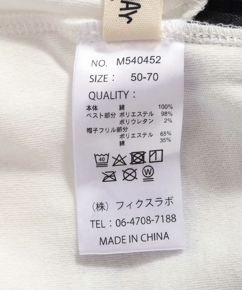 本体)綿100% ベスト部分)ポリエステル98% ポリウレタン2% 帽子フリル部分)ポリエステル65% 綿35%