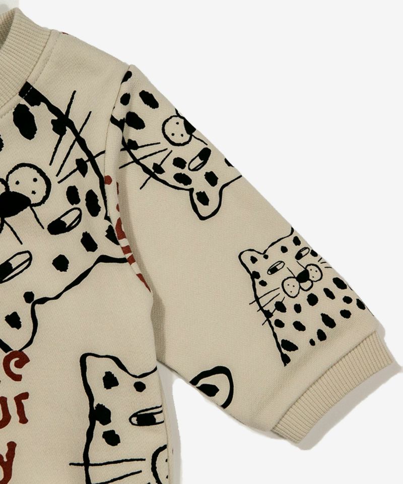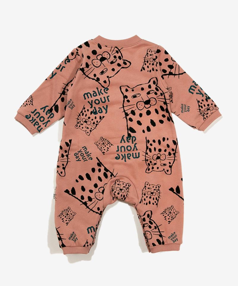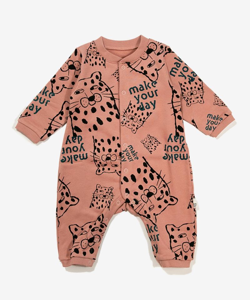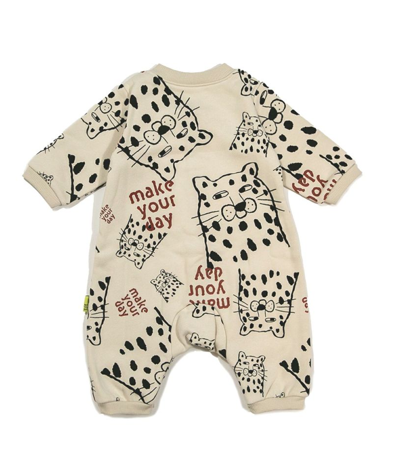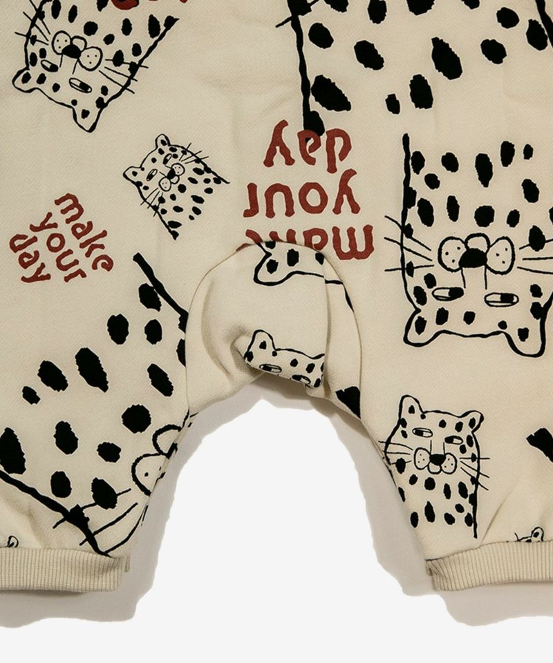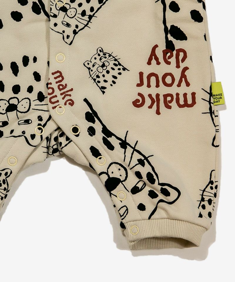 じっと何かを見つめているような、目をそらした瞬間のような、何ともいえないおとぼけ顔のヒョウさん。大きかったり小さかったり、たくさんカバーオールに乗っけました。