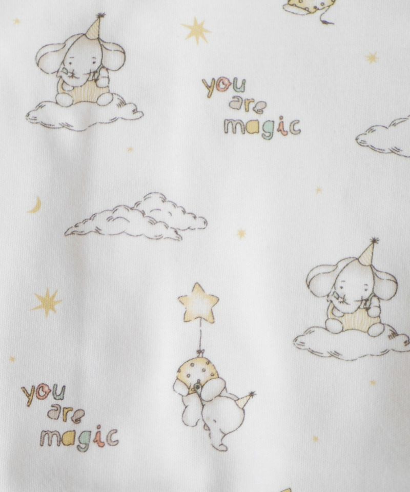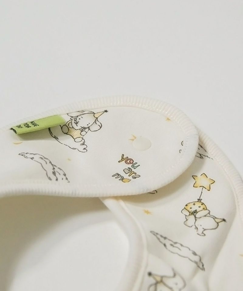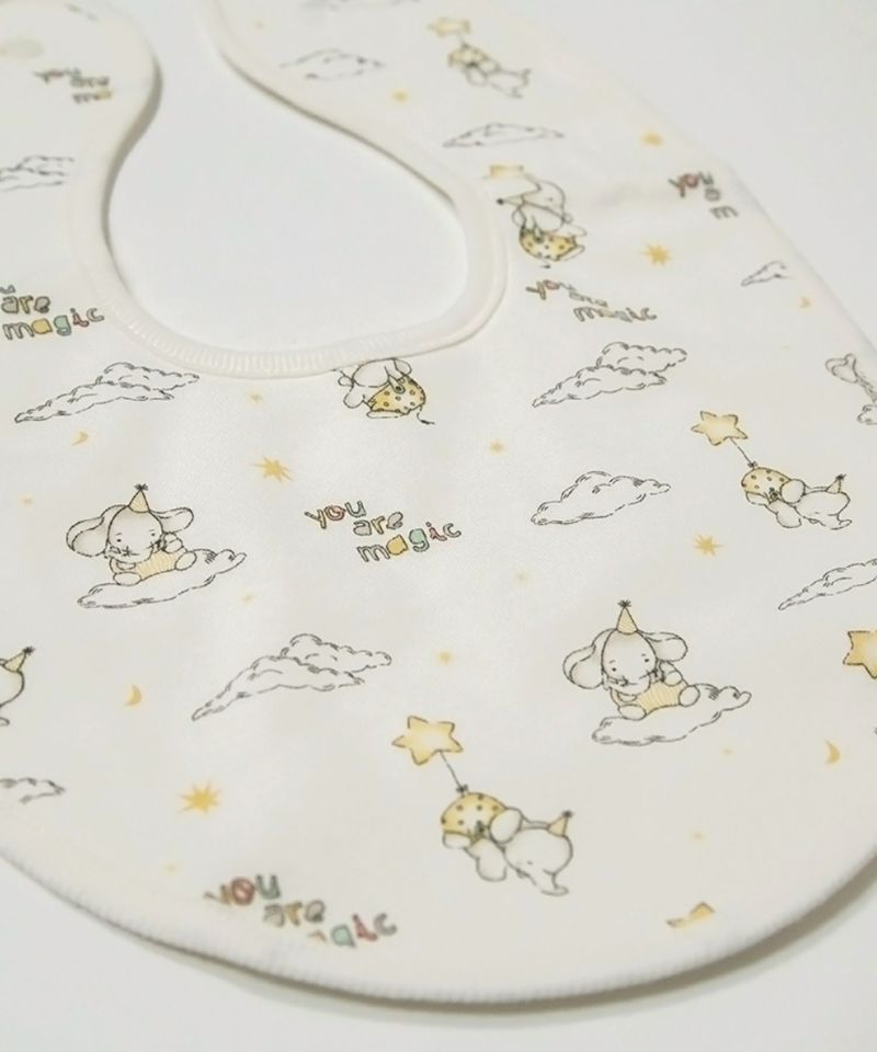 メルヘンチックな空を飛ぶゾウさんと、春らしい上品なチューリップ柄のベビースタイ。