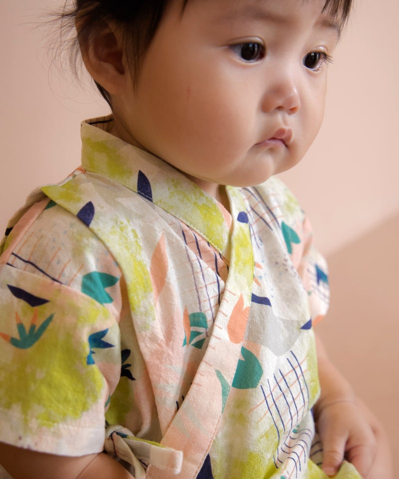 水彩絵の具で描いたような淡いカラーが美しい柄の甚平ロンパス。