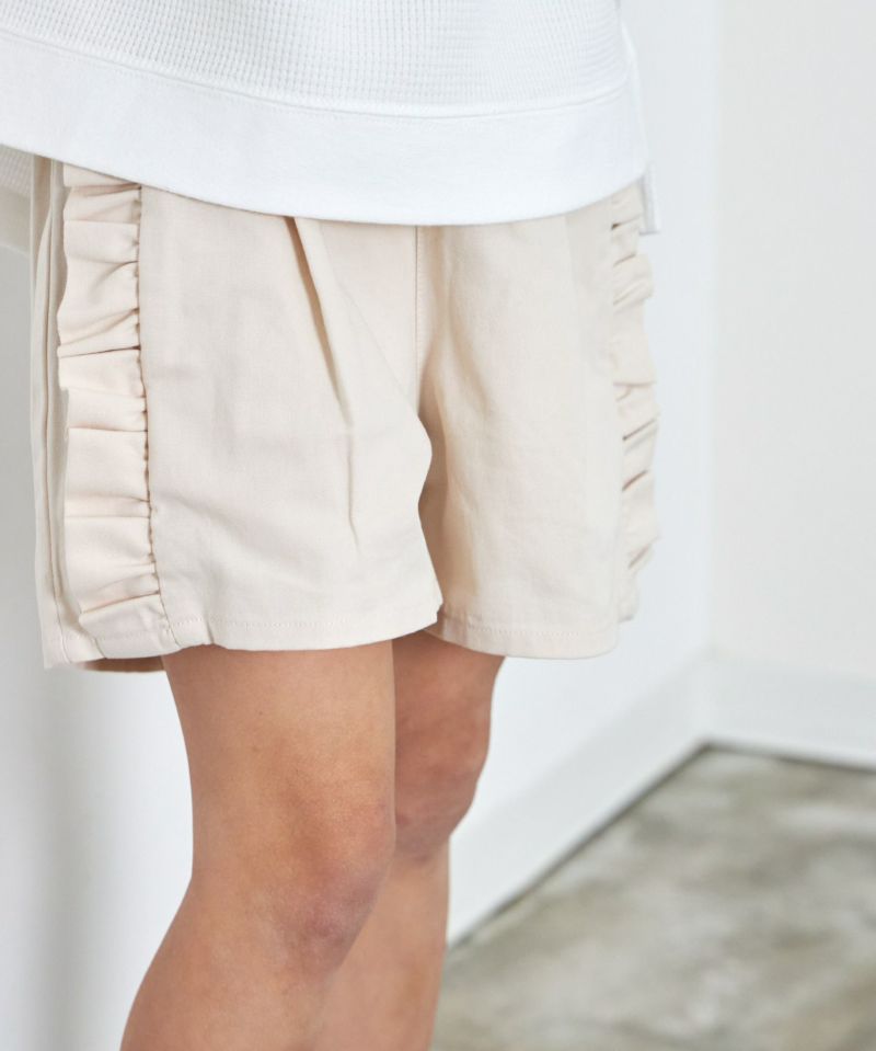 同色のフリルがさりげなくついているので甘くなりすぎず、どんなテイストのトップスにも合わせていただけます◎