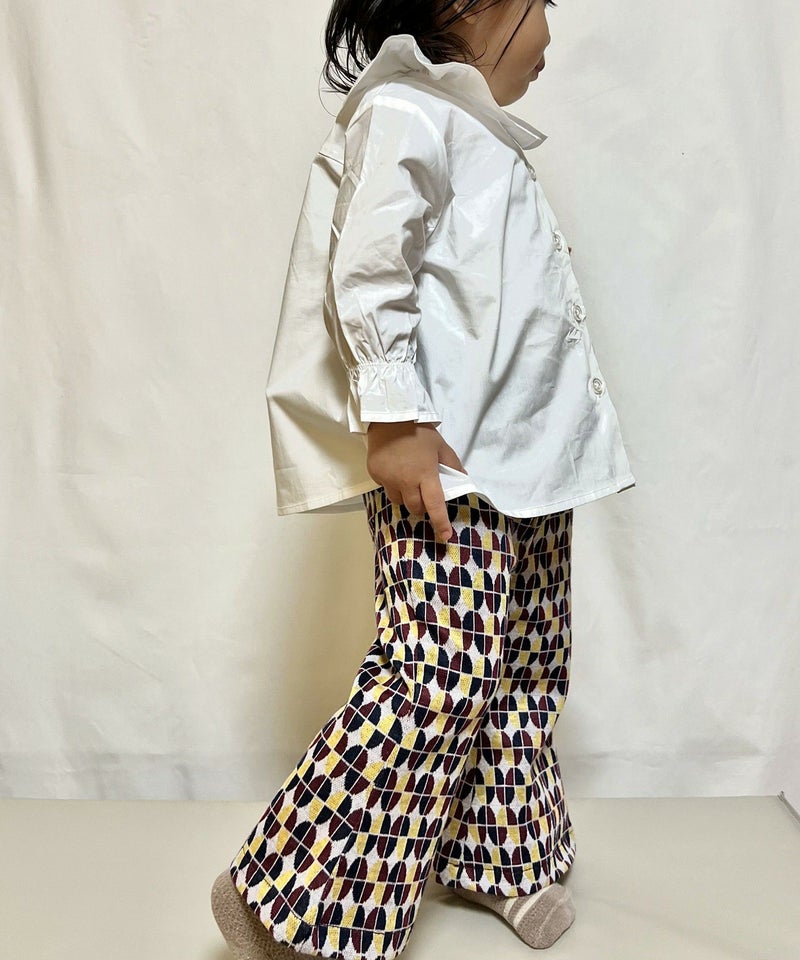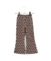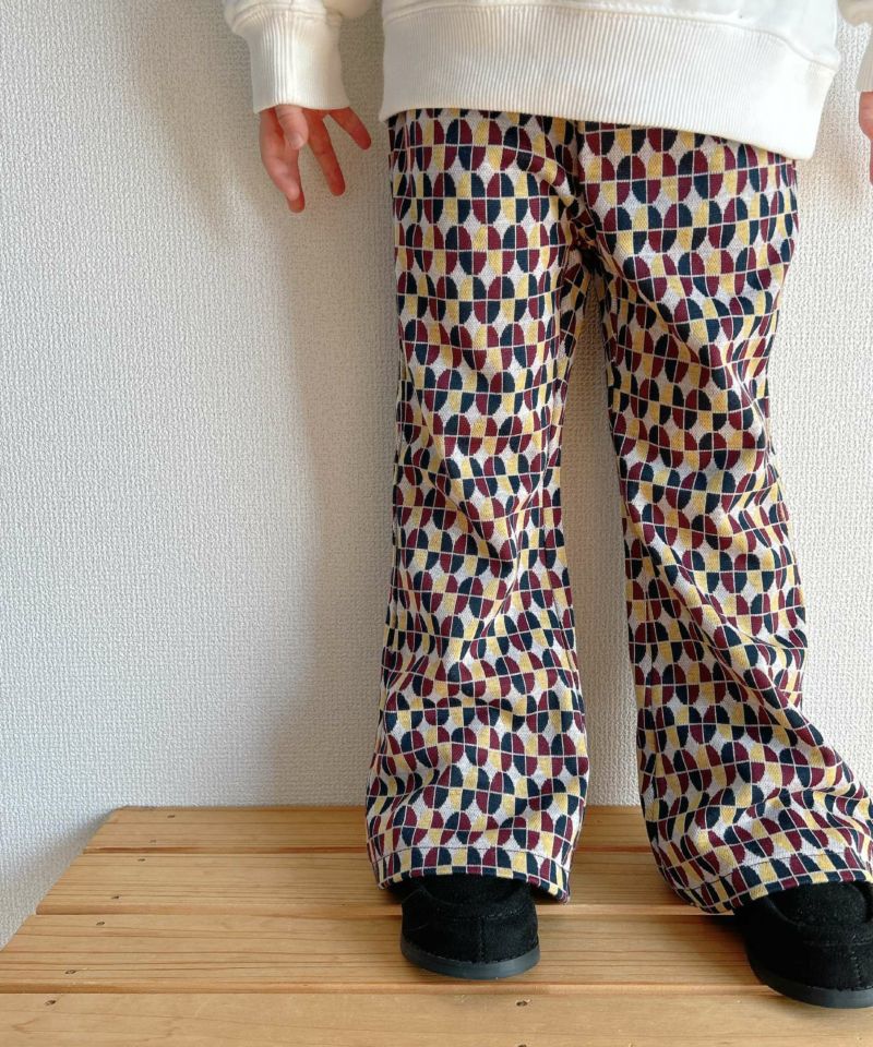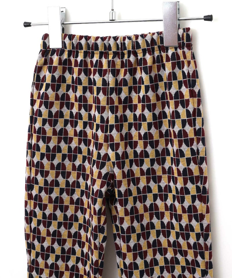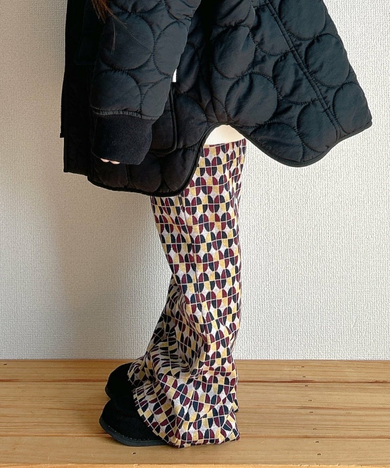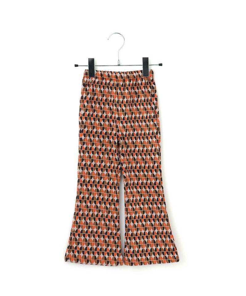 今季トレンドの光沢感と凹凸感のあるベロア素材と、レトロな幾何学柄を使用したフレアパンツ。
