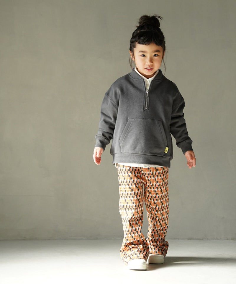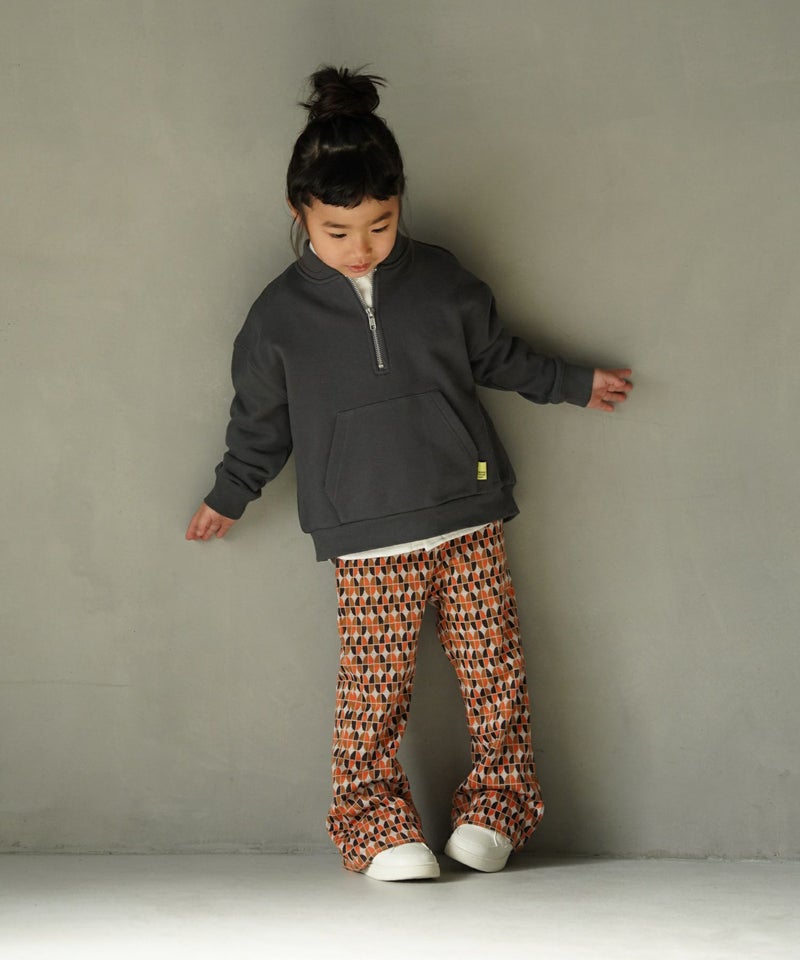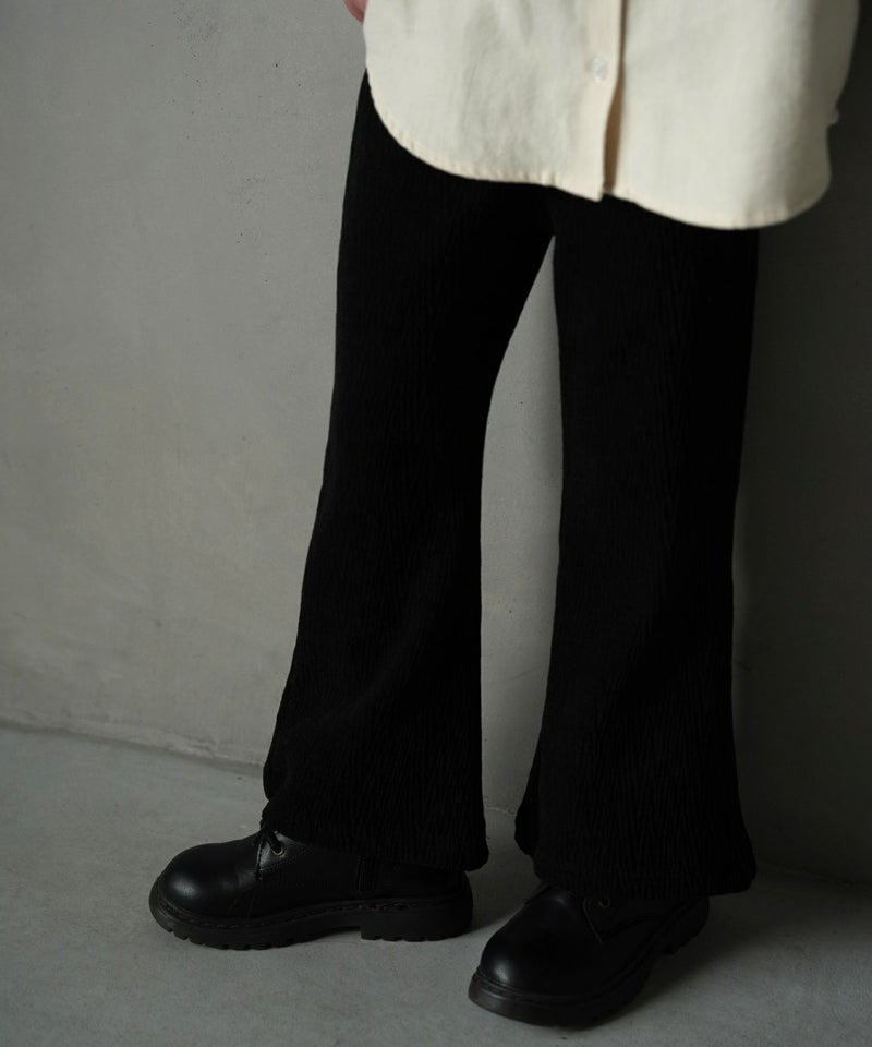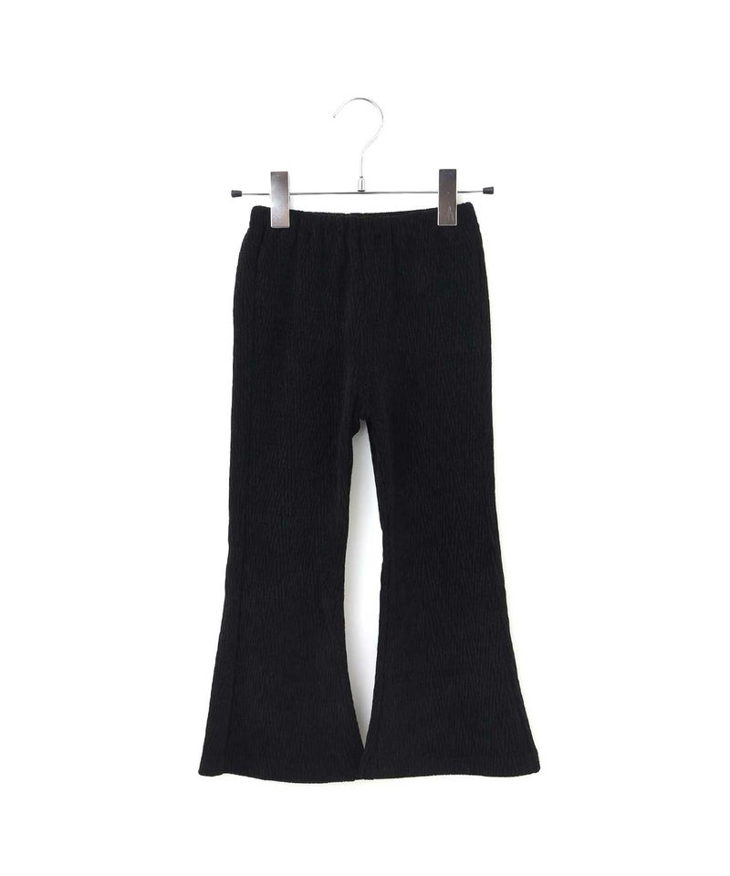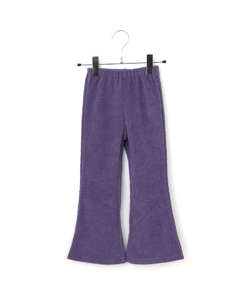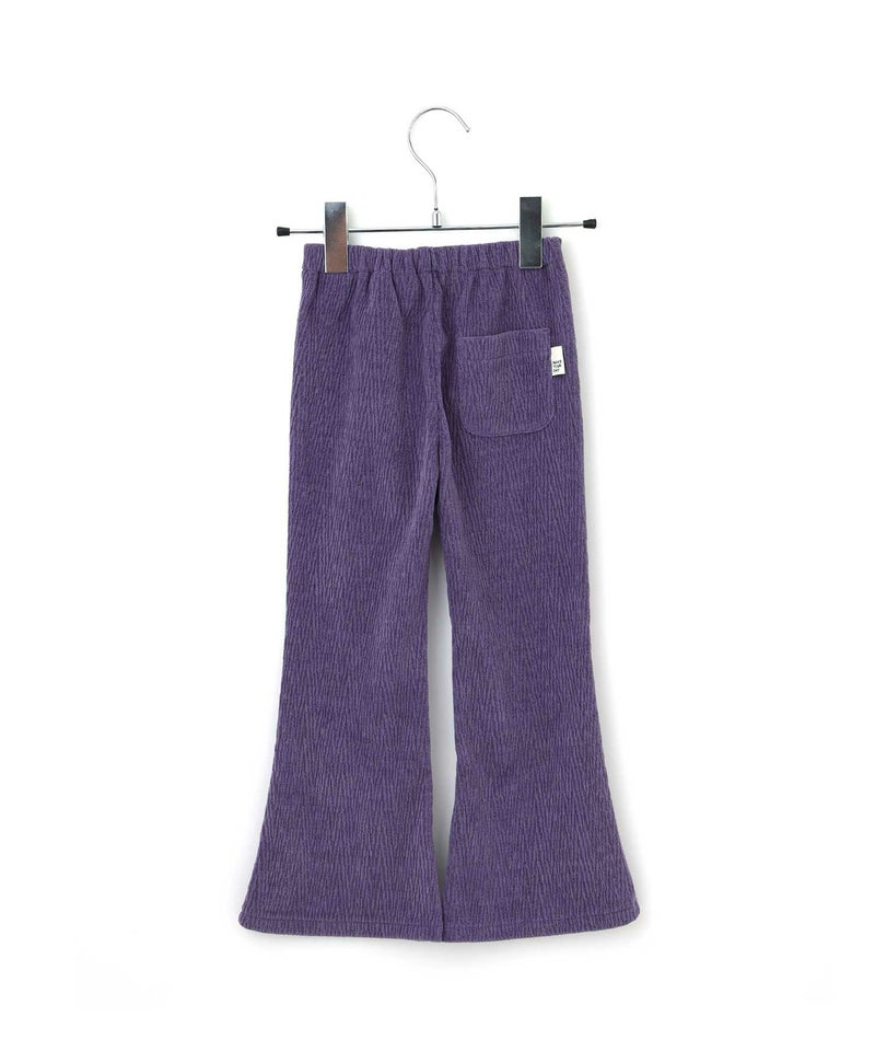 今季トレンドの光沢感と凹凸感のあるベロア素材と、レトロな幾何学柄を使用したフレアパンツ。