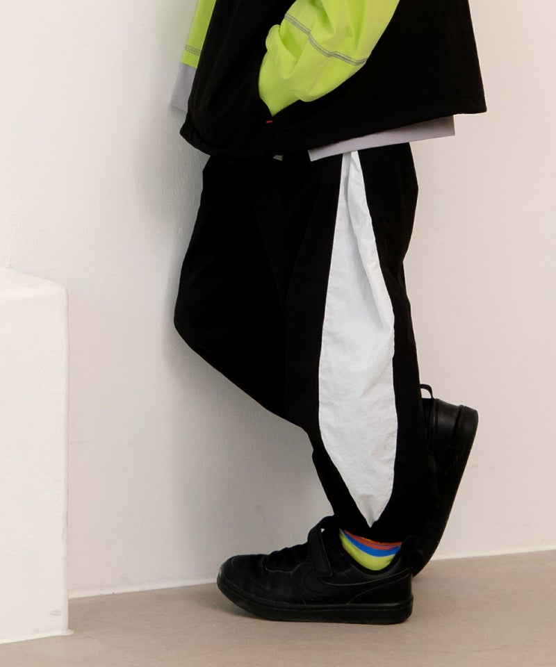 バイカラーで個性が光るパラシュートパンツ。