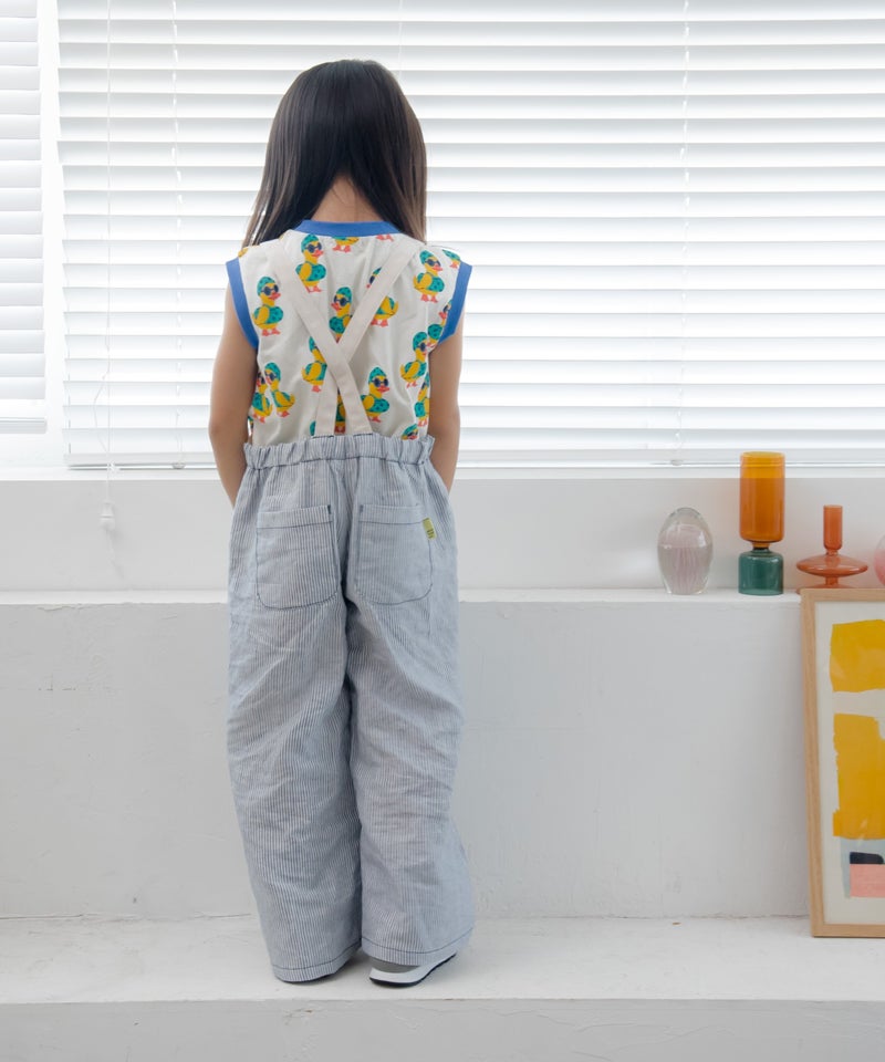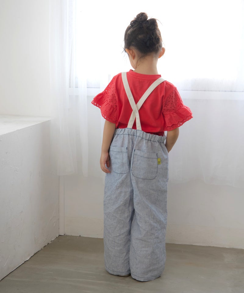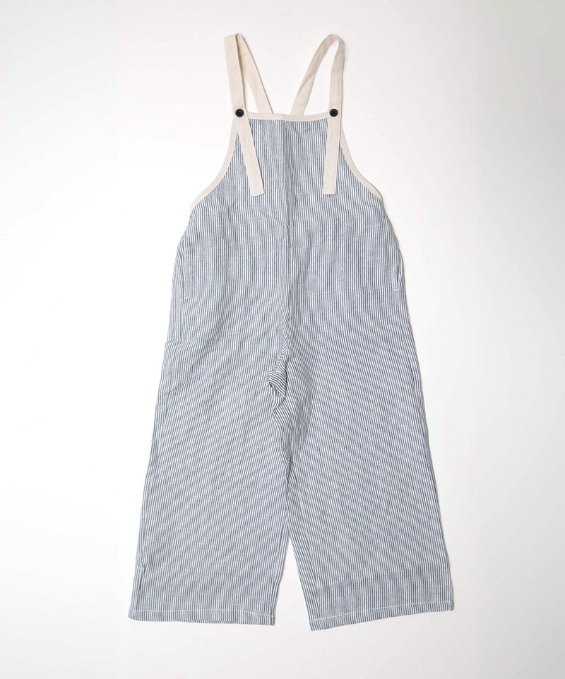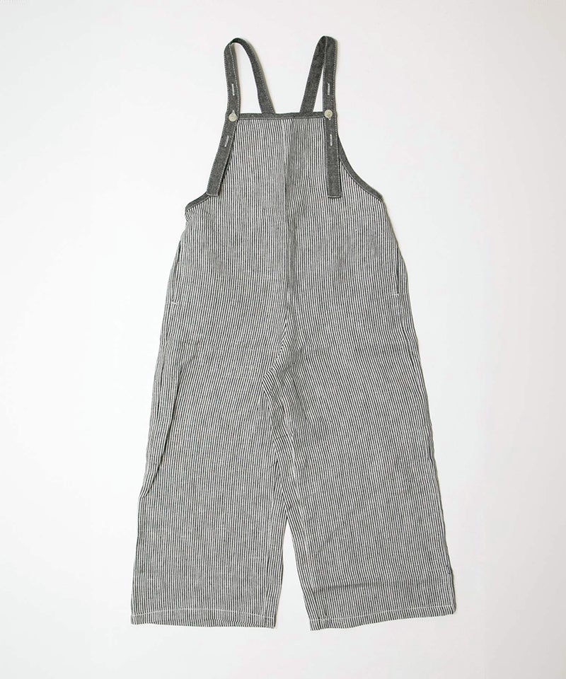 ボトム部分は少しワイドなシルエットで、肩ベルト部分は3段階で調整ができるのでお好きな丈感で着用いただけます。