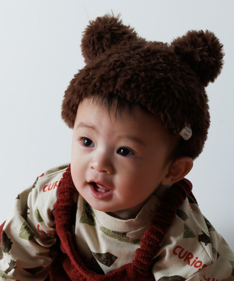 立体的なくま耳がついていて、かぶるとまるでくまさんのぬいぐるみみたいに周りの大人を笑顔にする魔法がかかります!