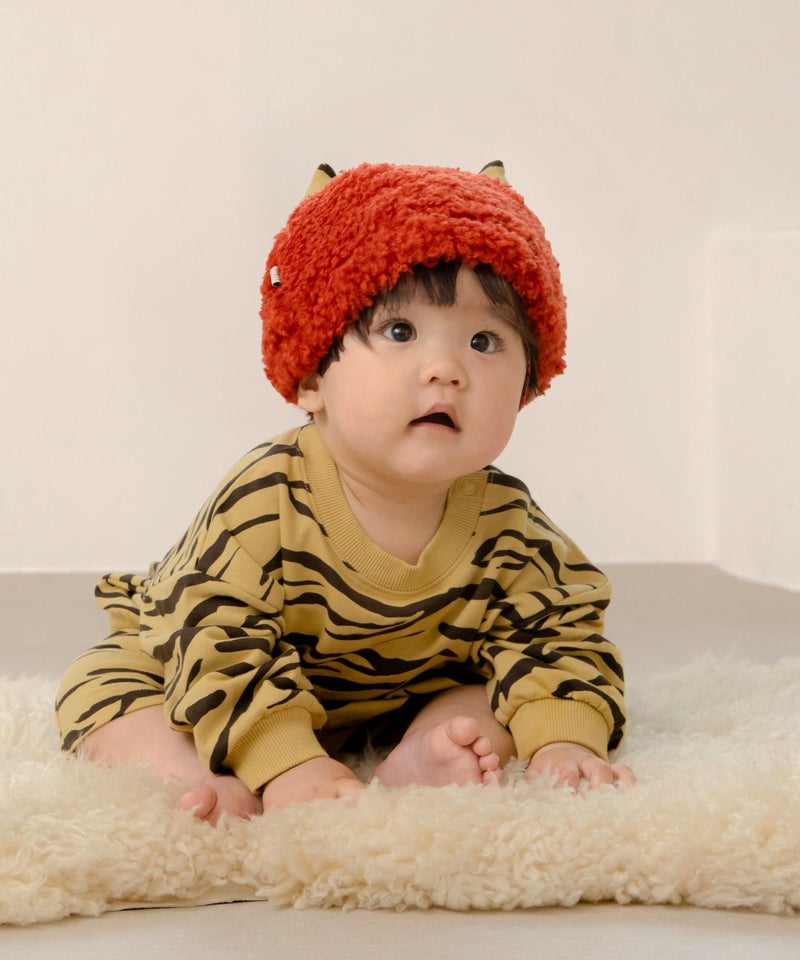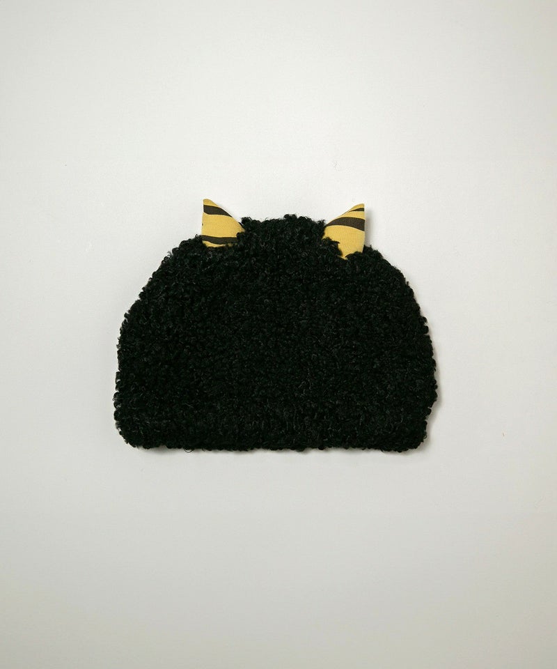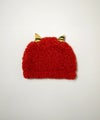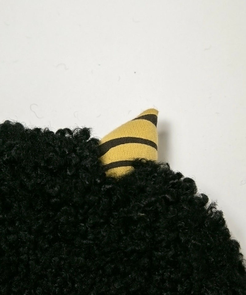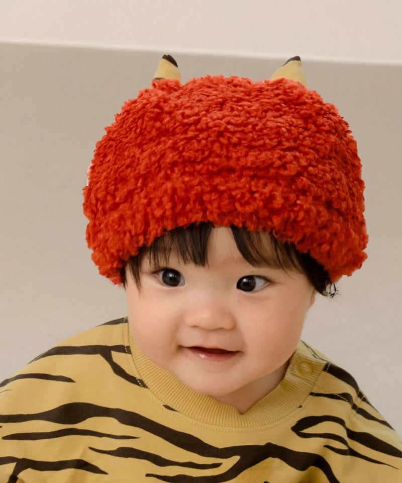 ブークレー糸を使用したやわらかいおにの帽子にはちょこんと小さいなツノが生えています。