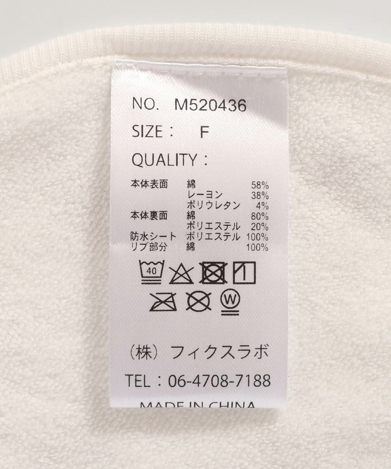 本体表面)綿58% レーヨン38% ポリウレタン4% 本体裏側)綿80% ポリエステル20% 防水シート)ポリエステル100% リブ部分)綿100%