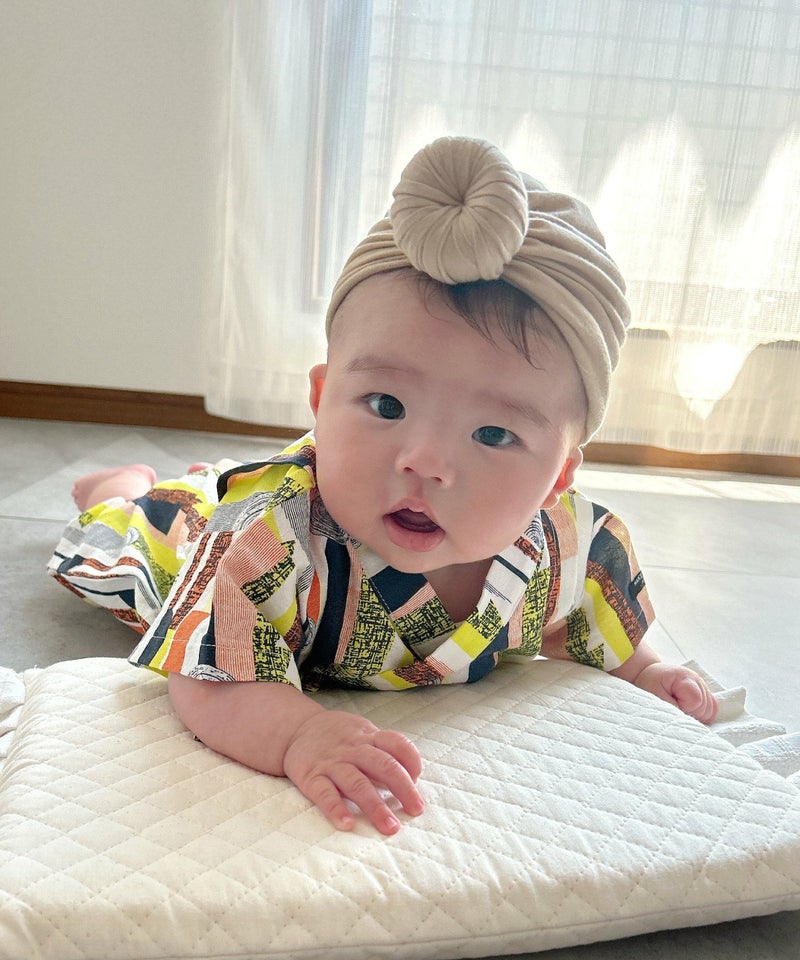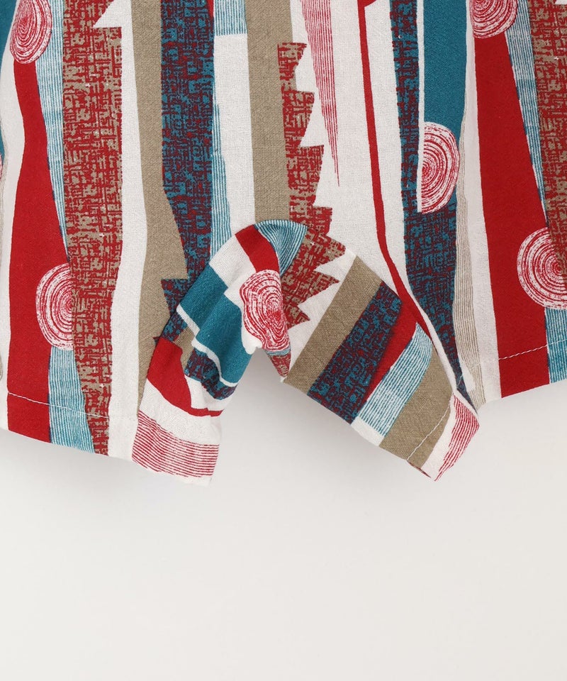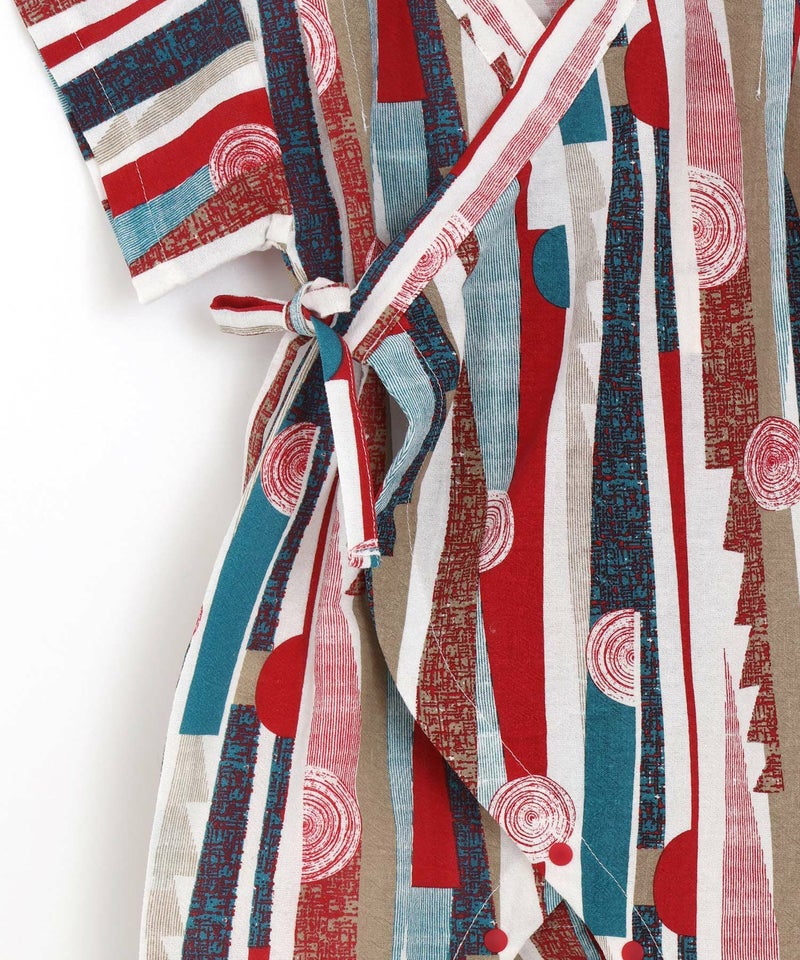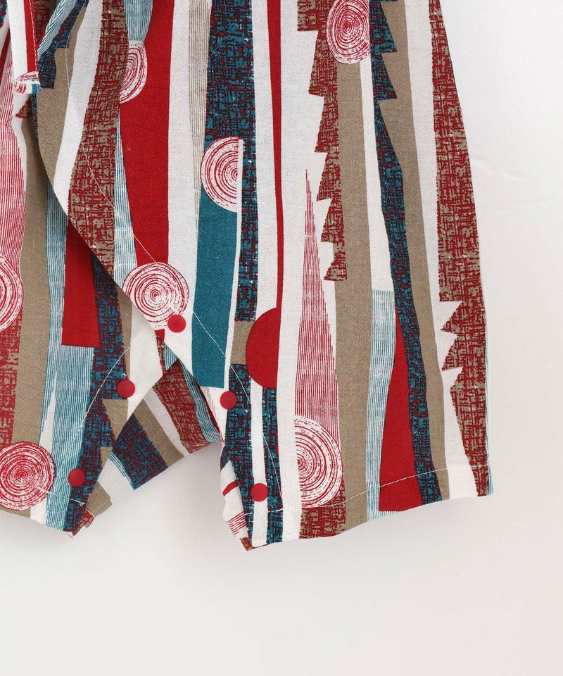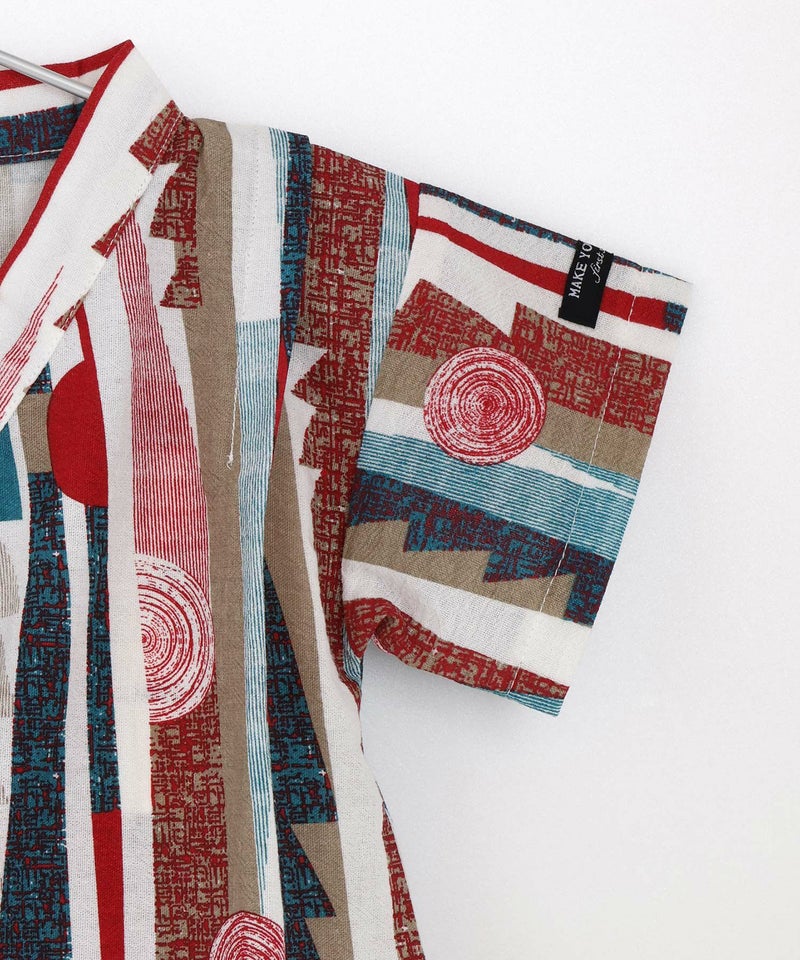 レトロモダンな印象の幾何学柄の甚平ロンパス。
